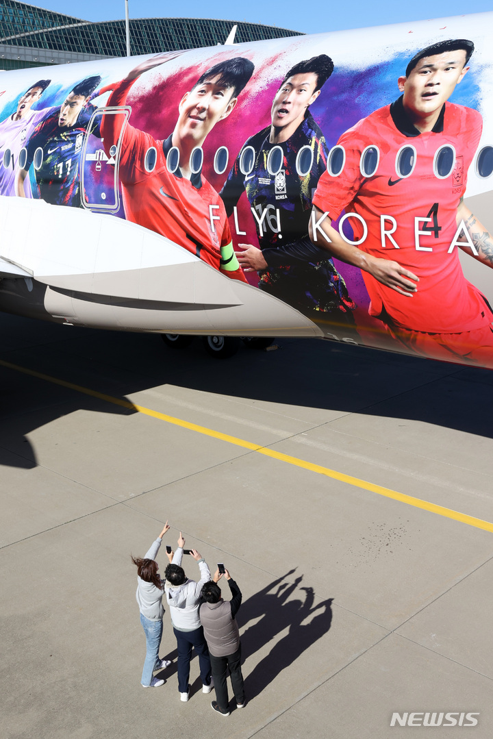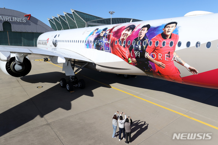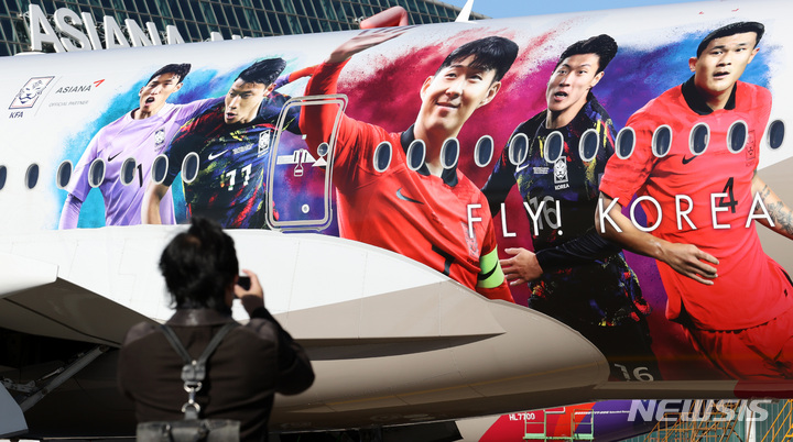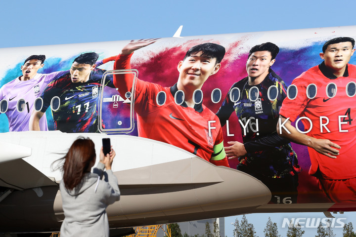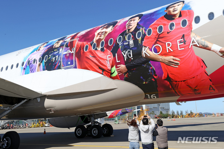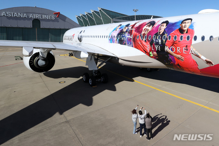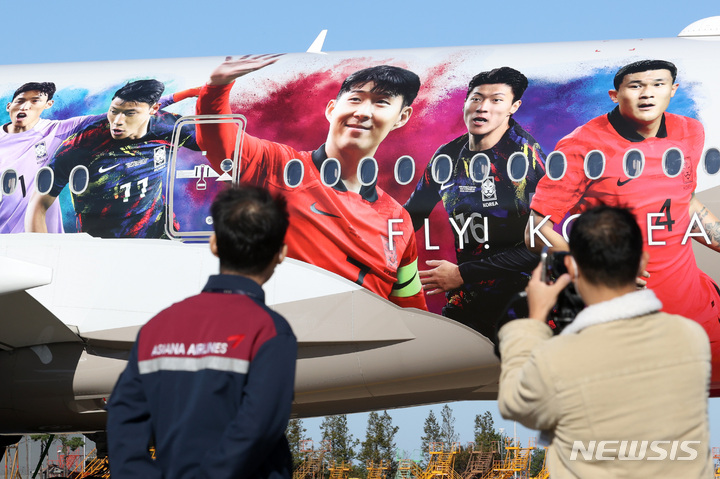 仁川市中区にあるアシアナ航空の格納庫駐機場で17日午前、サッカー韓国代表チームの善戦を祈願するラッピング飛行機が公開された。