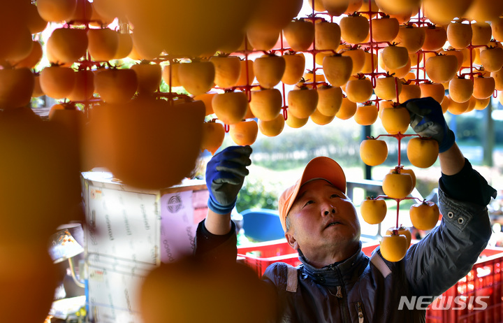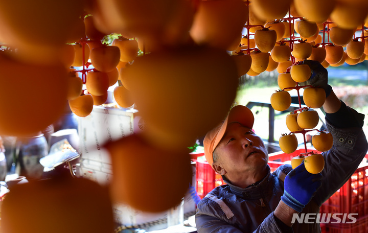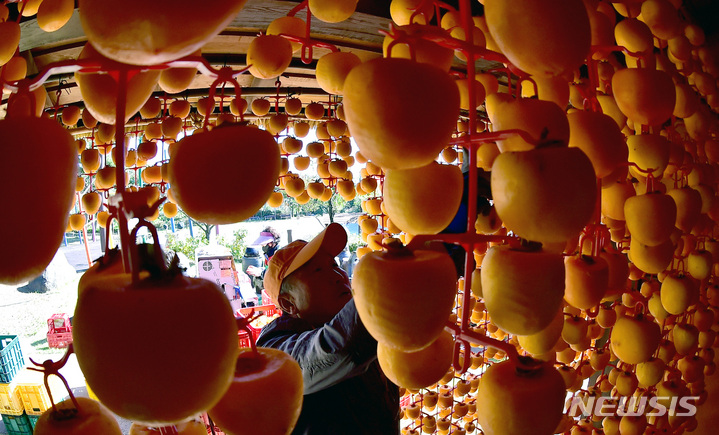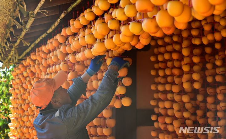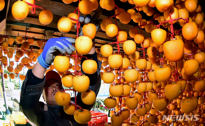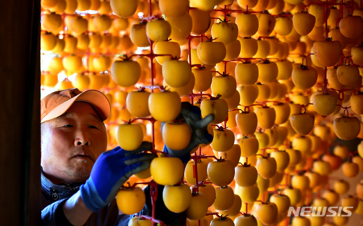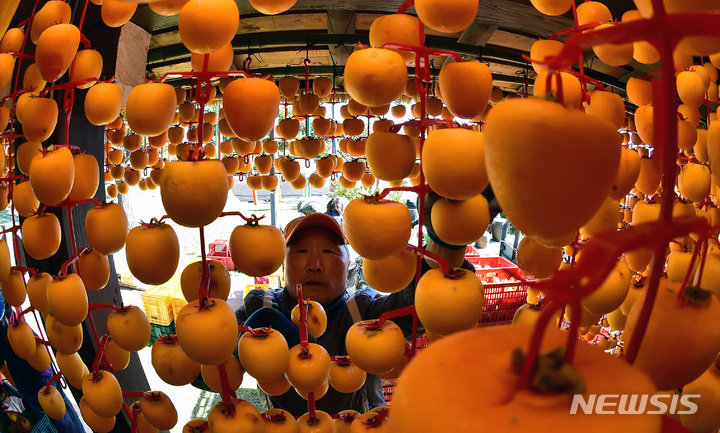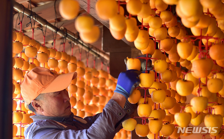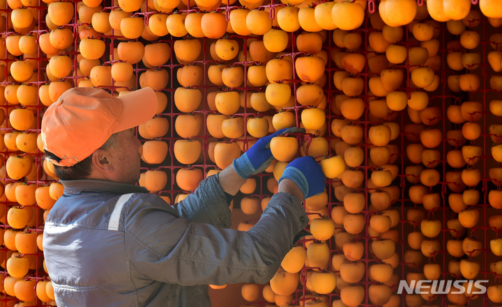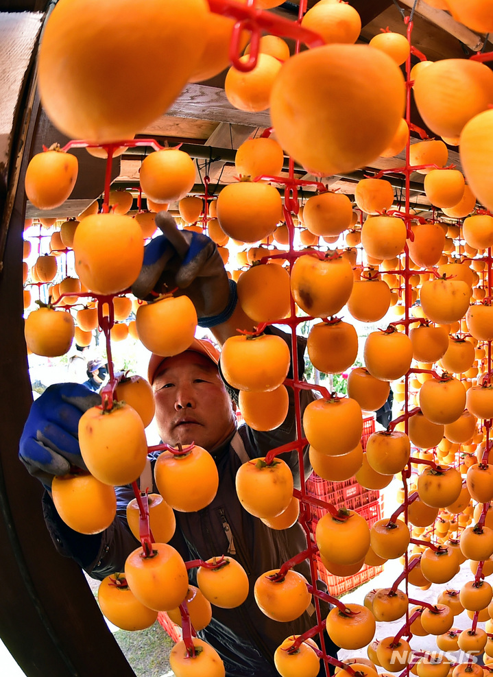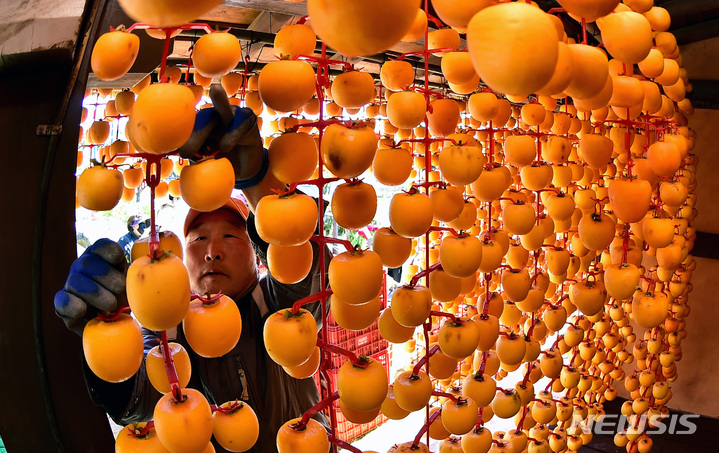 二十四節気の一つで、霜が降りはじめるころを意味する「霜降」まであと三日と迫った19日午後、慶尚北道尚州市外南面の尚州干し柿公園では、ある住民が皮をむいた柿を干すため糸につるしていた。