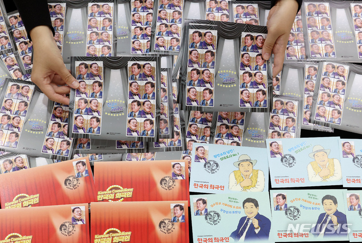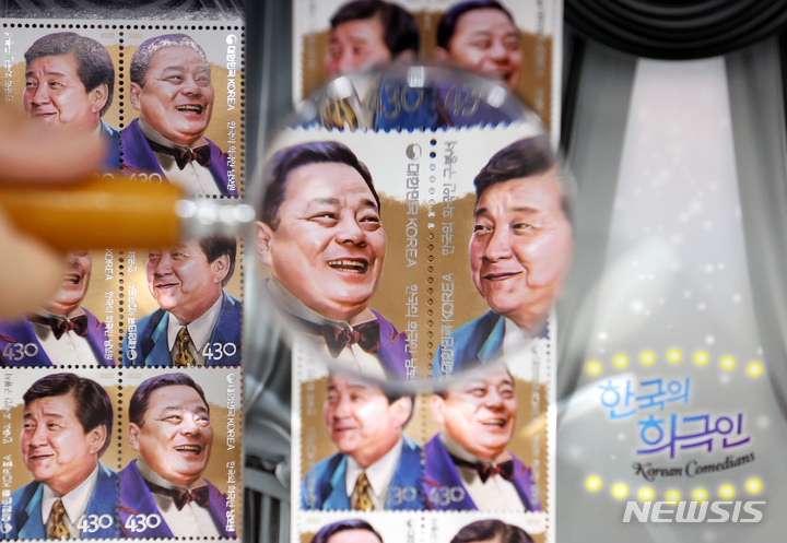 ソウル中央郵便局切手博物館(ソウル市中区)で25日午後、「韓国のコメディアン」ク・ボンソとナム・ボウォンを主人公にした記念切手を披露する職員。
