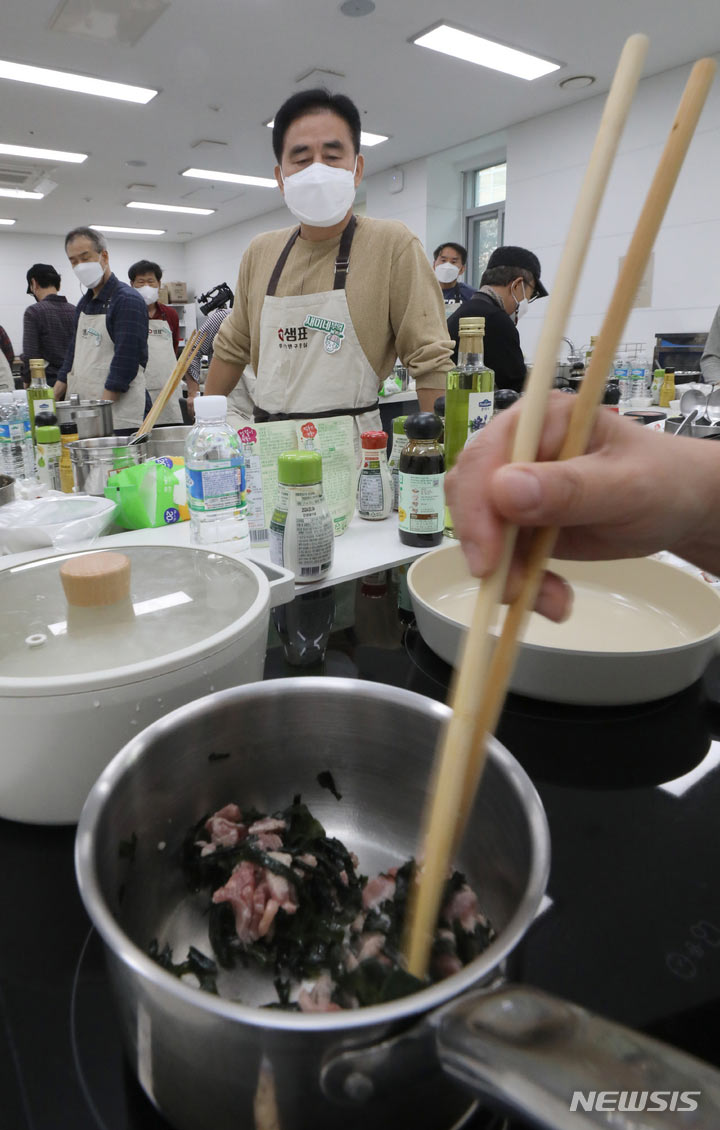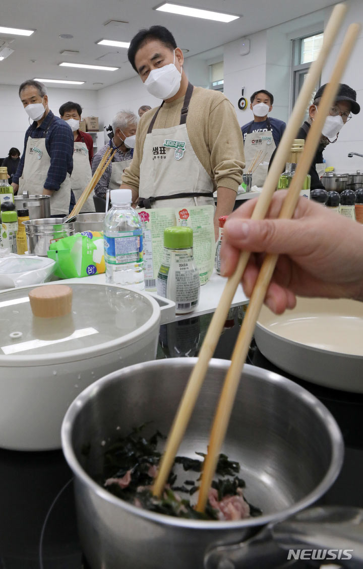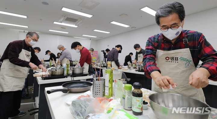 27日午後、ソウル市恩平区の「ソウル市50プラス」西部キャンパスで開かれた「セムピョと一緒のクッキングクラス」にて、家族にふるまう誕生日の料理を学んでいる中年男性らの様子。