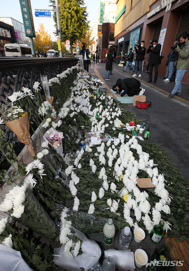 ソウル市竜山区の繁華街・梨泰院で発生した雑踏事故の現場近くにある梨泰院駅1番出口そばの犠牲者追悼空間では31日午前、故人に哀悼の意を示す市民らの姿が見られた。