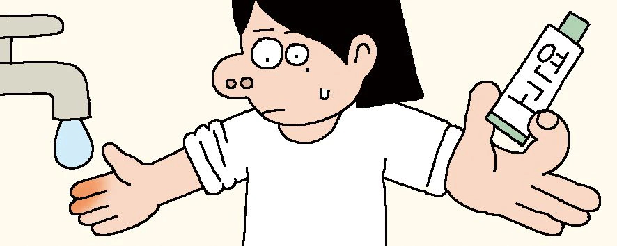 軽いやけどをした時は、冷たい流水で冷やした後、やけど用の軟膏を塗る。やけどした部位をこすったり、水ぶくれを破ったりすると、治りにくくなることがある。