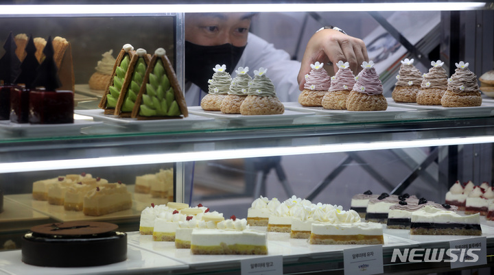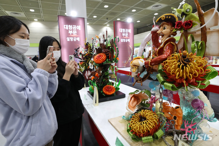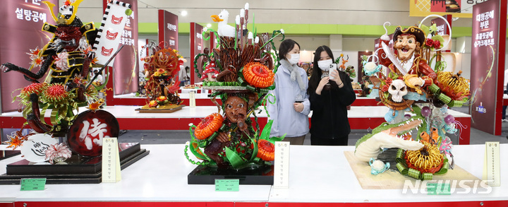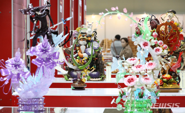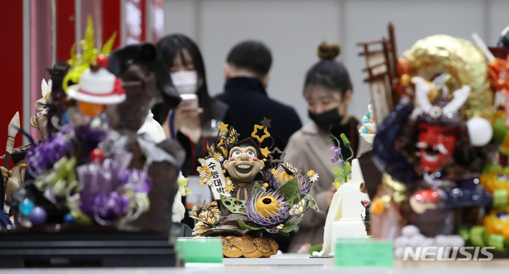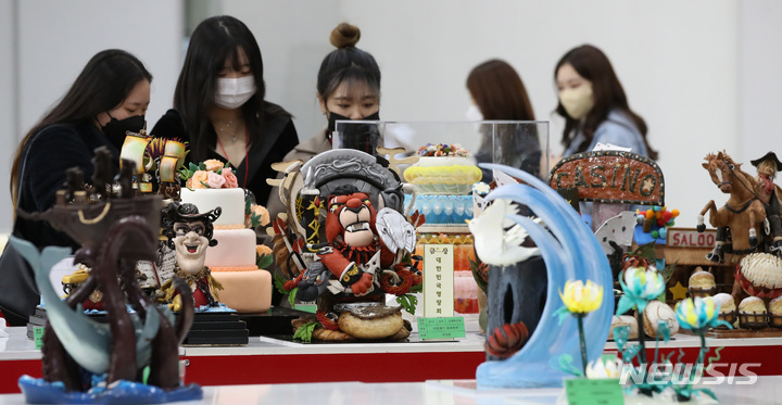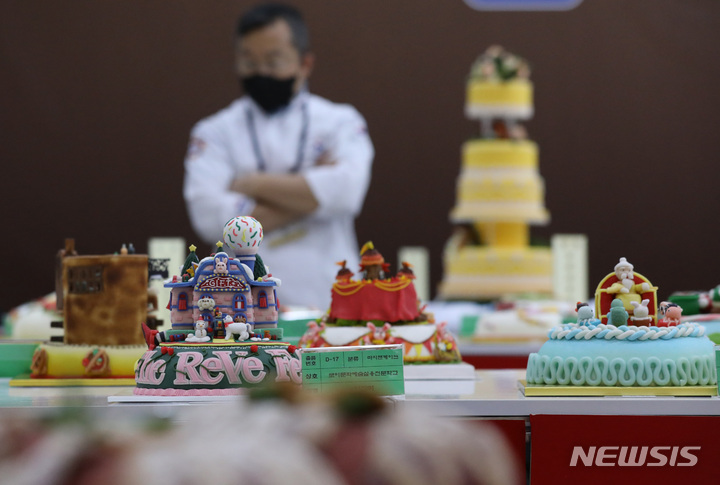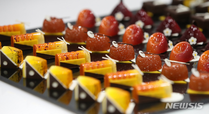 ソウル市江南区のCOEXで2日に開幕した「COEXフードウィーク 第17回ソウル国際食品産業展」で、「ベーカリーフェア」の一環として、競演大会に出品されたプチケーキなどの作品が展示されている様子。ベーカリーフェア、コリア・フードテック産業展、ドリンク&デザート・ショーなどからなるCOEXフードウィークは、5日まで四日間の日程で行われる。