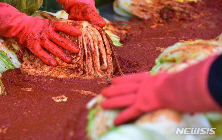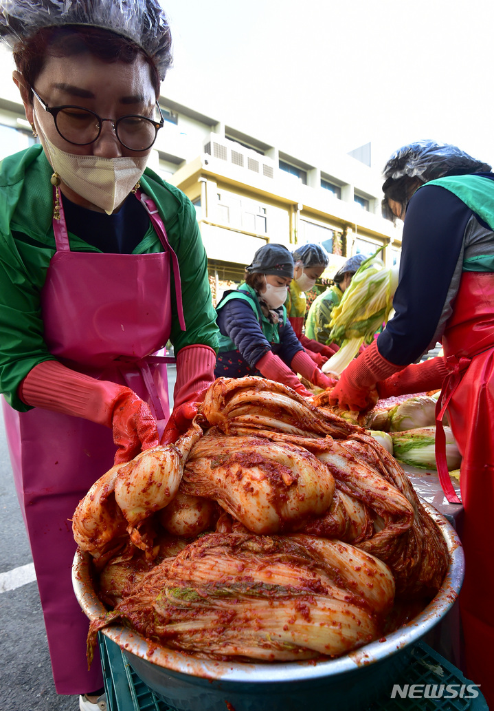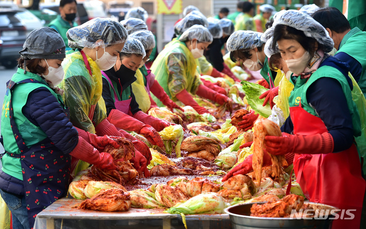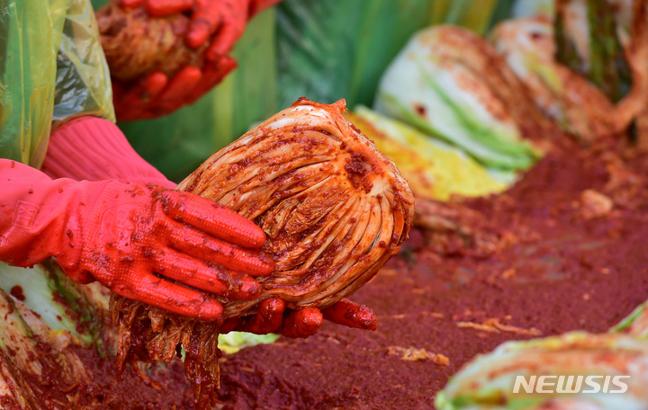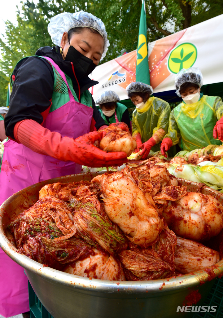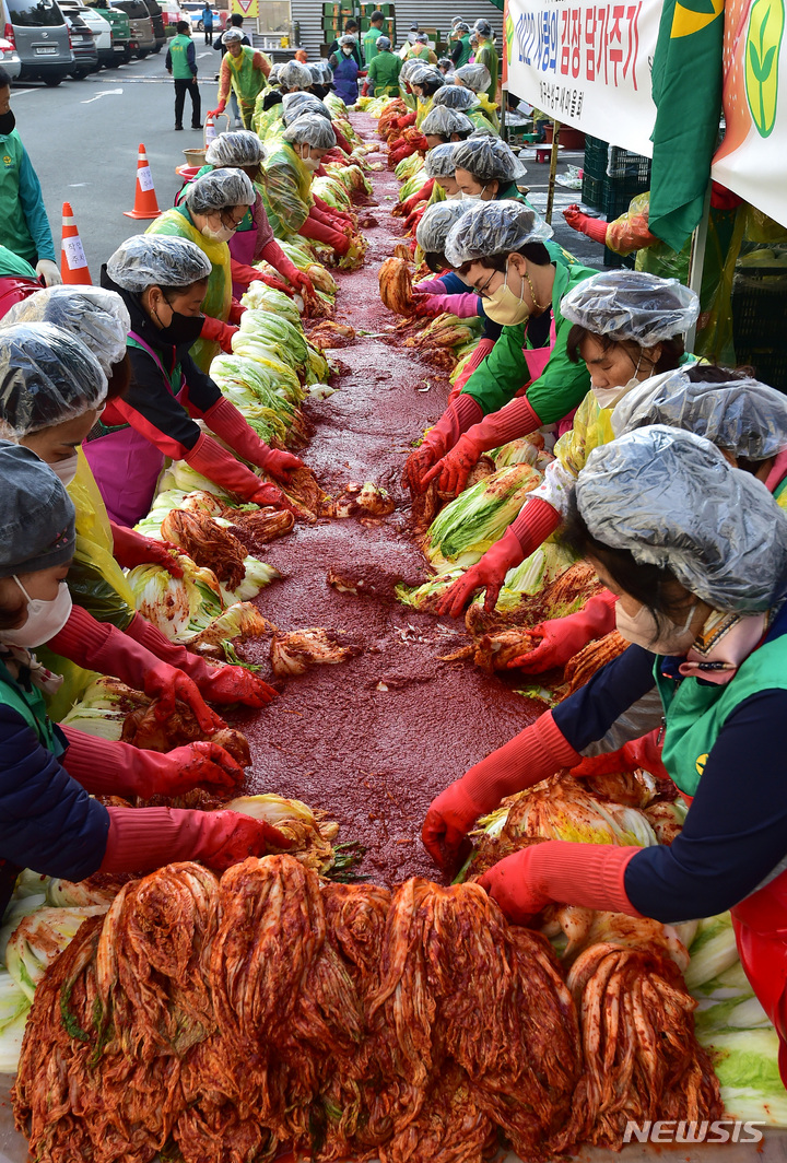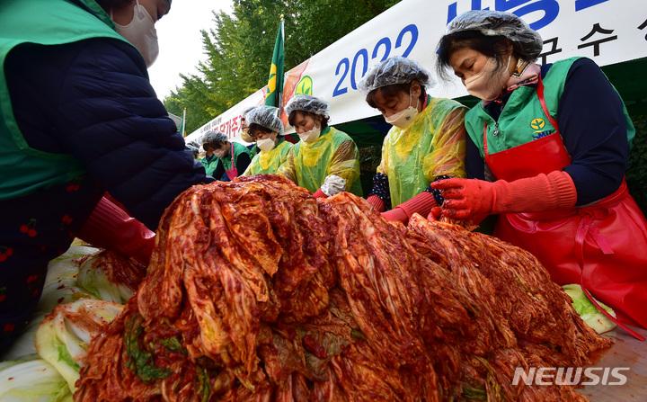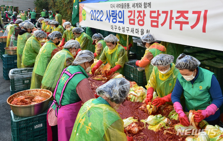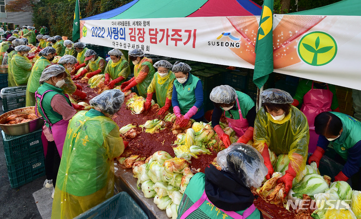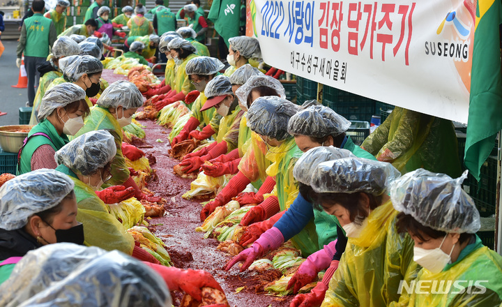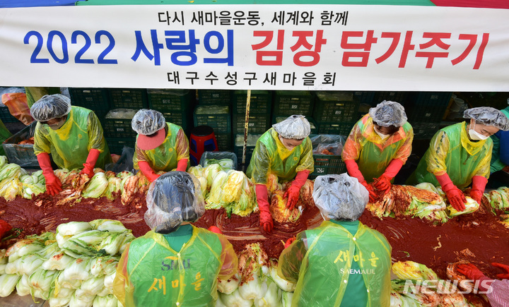 大邱市寿城区庁の駐車場で2日、「2022 愛のキムジャン漬け込み」イベントが開かれ、同区のセマウル会のメンバーなどボランティアがハクサイにヤンニョムをあえている様子。この日作られたキムジャンキムチは、寿城区管内23洞の恵まれない人々800世帯に配られる予定だ。