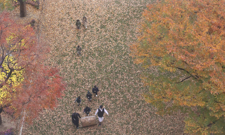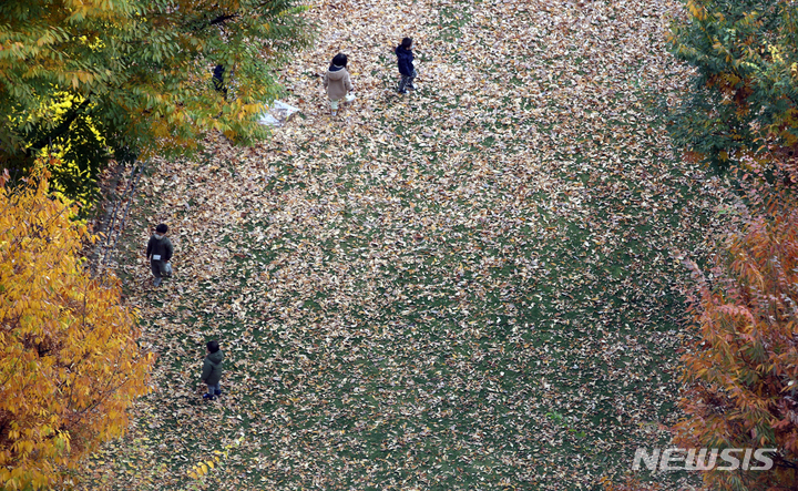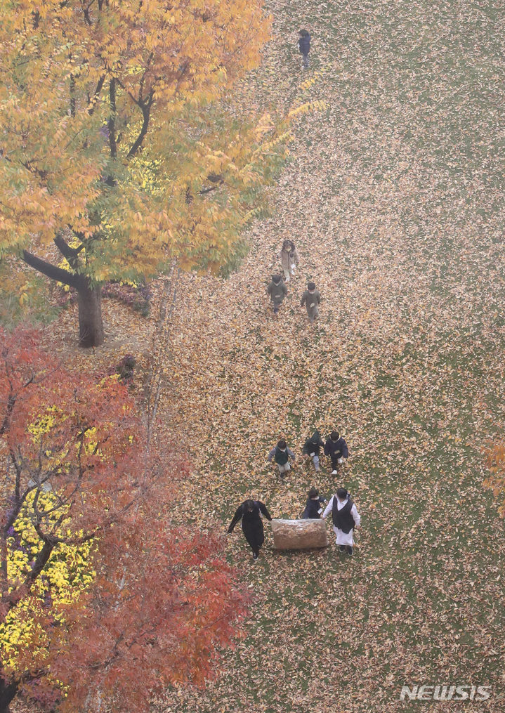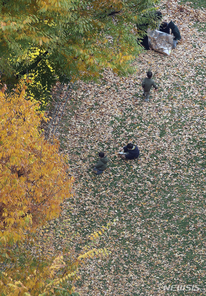 ソウルの世宗路で3日、子どもたちが秋の落葉の中で楽しいひとときを過ごしている様子。