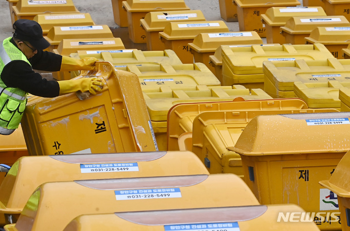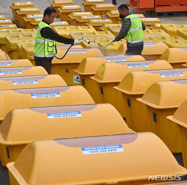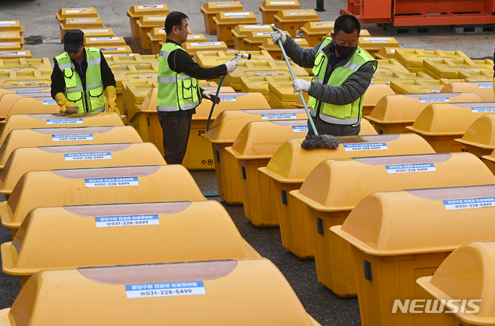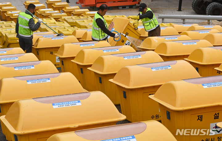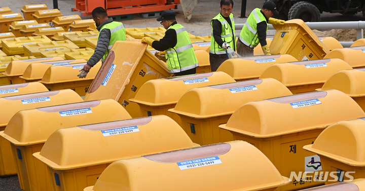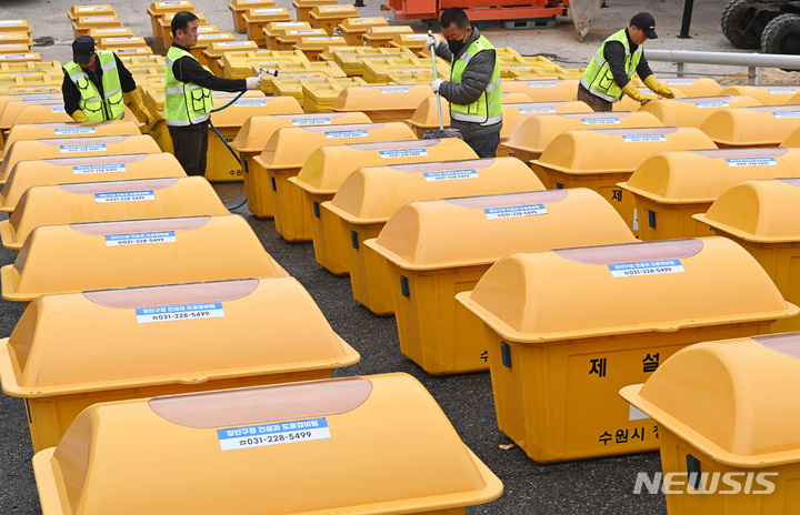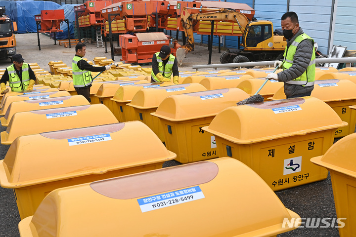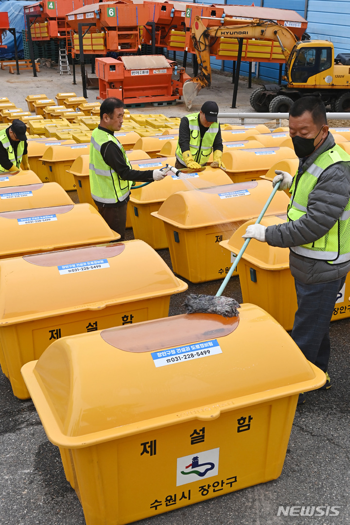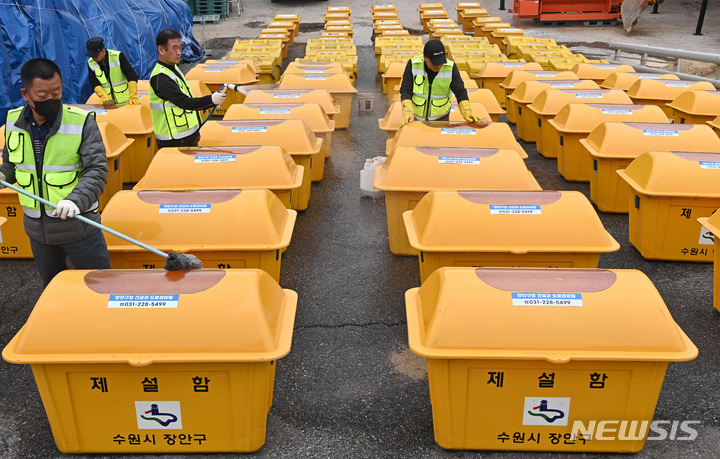二十四節気の一つ「立冬」まであと四日と迫った3日午後、京畿道水原市の長安区庁安全建設課資材倉庫では、関係者が除雪箱を洗浄して冬支度をしていた。