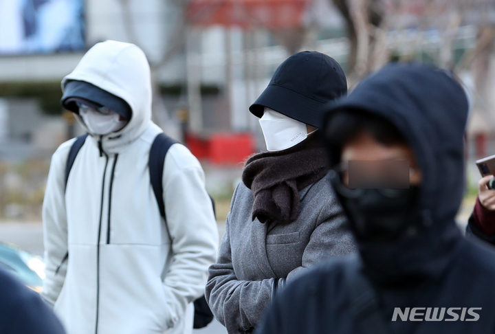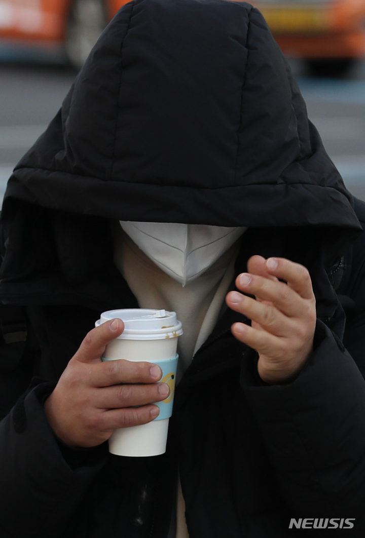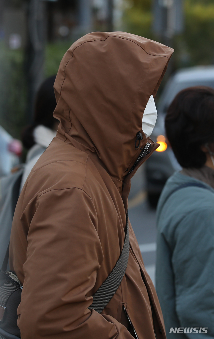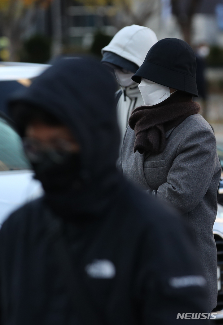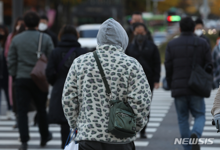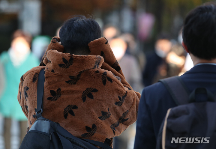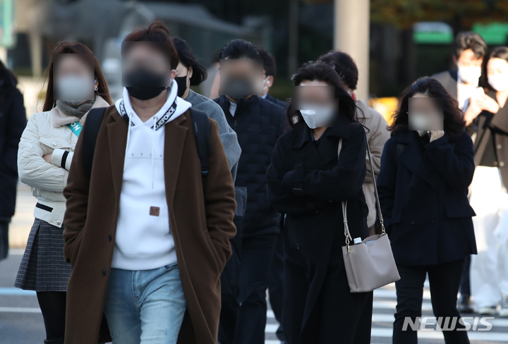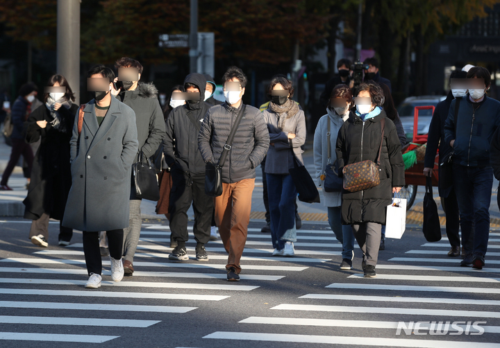 【NEWSIS】韓国中部地方の各地で気温が氷点下まで下がり、この秋で最も寒い朝となった4日、ソウル・光化門交差点を歩く人々。