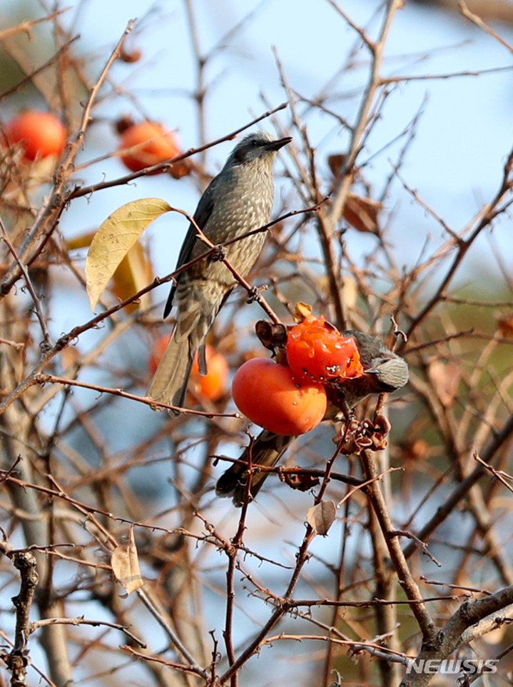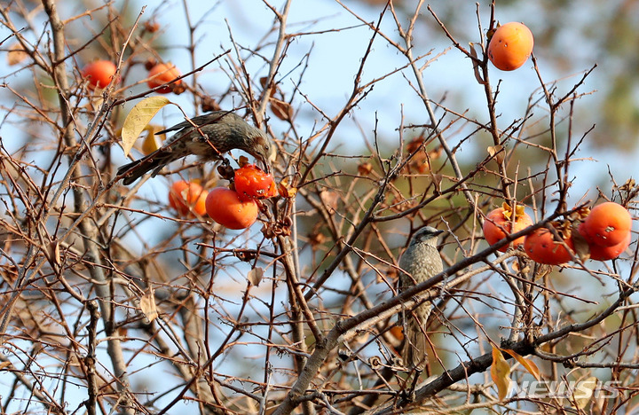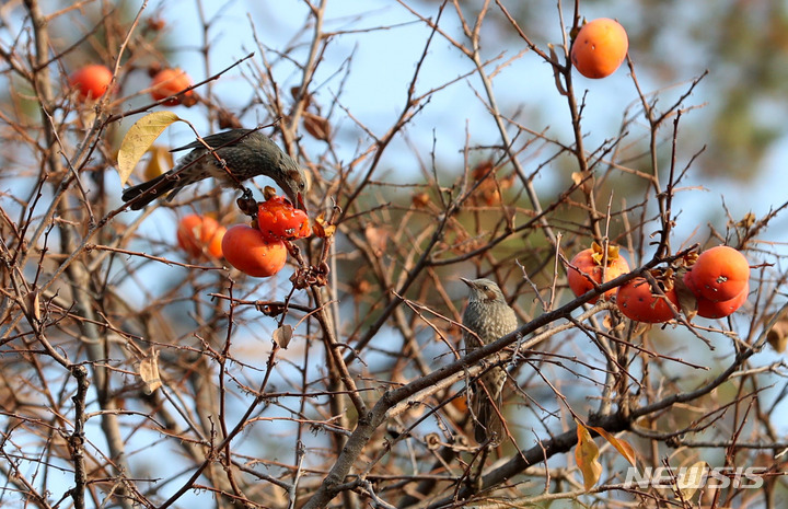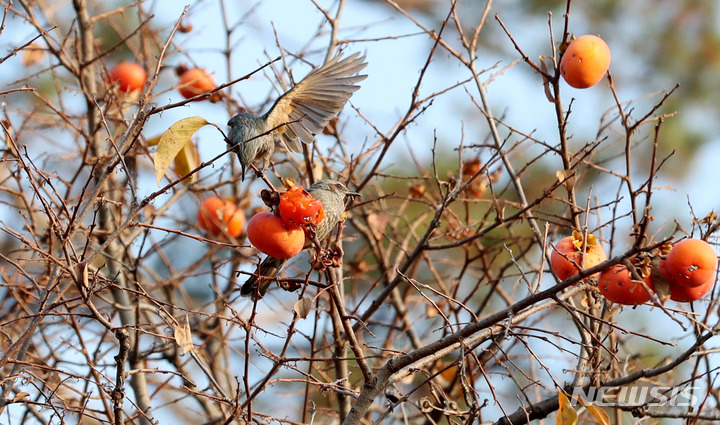 ソウル市江南区の奉恩寺で8日午前、鳥たちが食べられるよう残されていた柿をヒヨドリがついばんでいた。