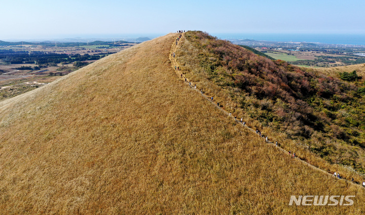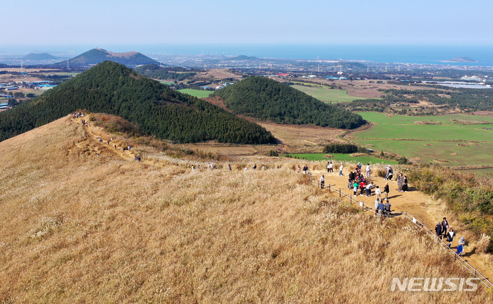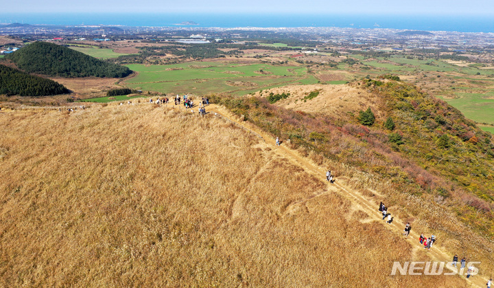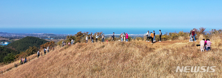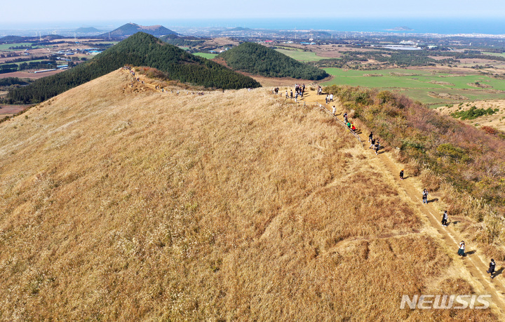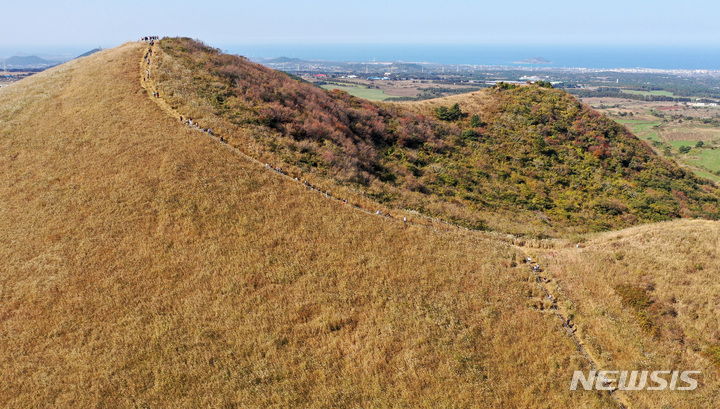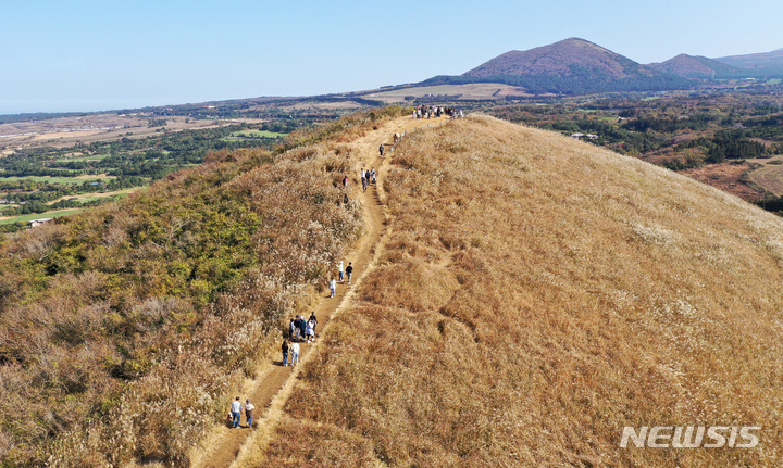穏やかな一日となった8日午前、済州市涯月邑鳳城里のセビョルオルムの稜線では、晩秋の情緒を感じるために訪れた観光客らの姿が見られた。