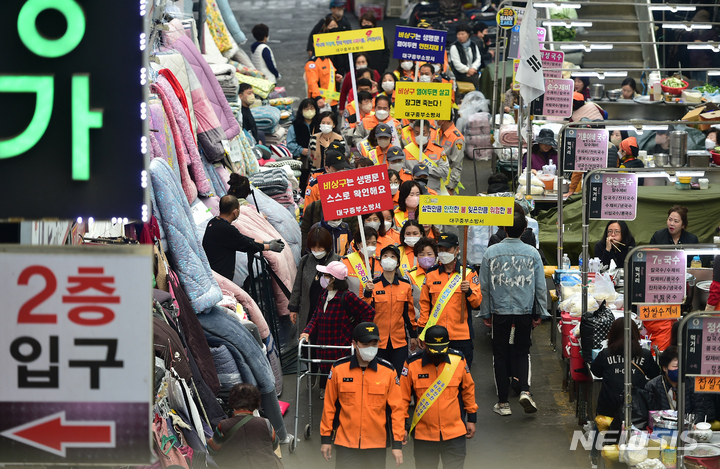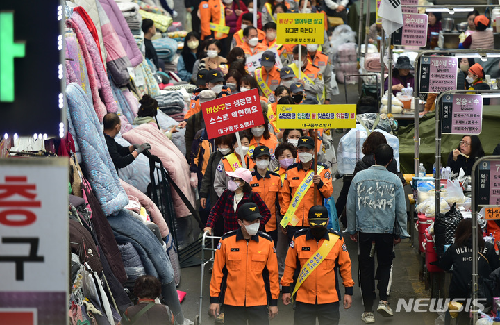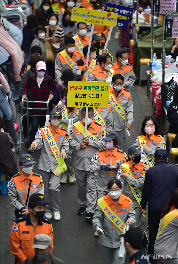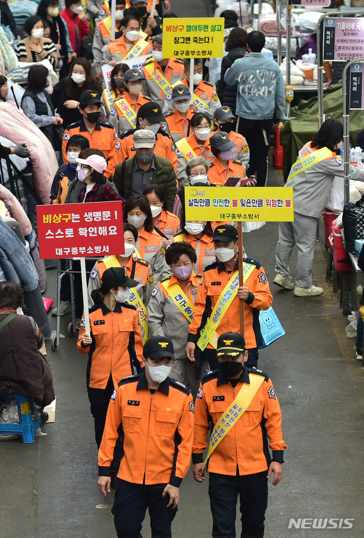 大邱市中区の西門広場で9日午前、消防公務員や義勇消防隊など協力団体の関係者らが、「消防の日」に合わせて火災予防キャンペーンを行っている様子。