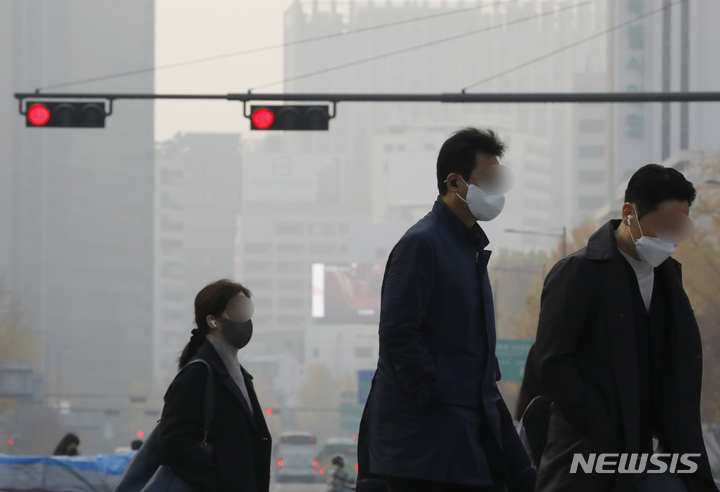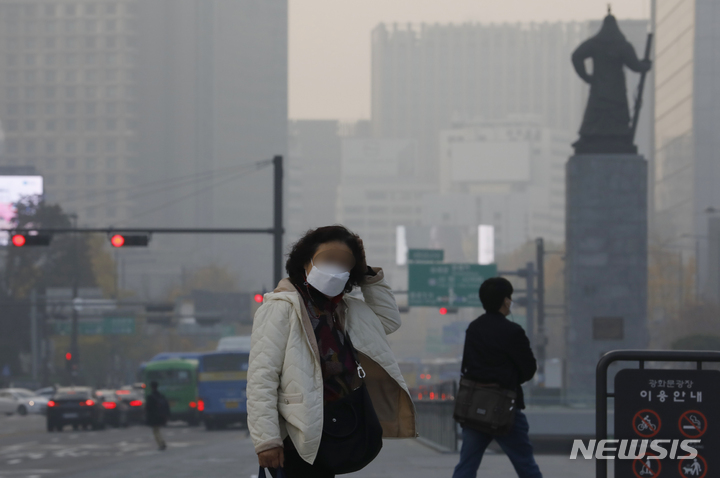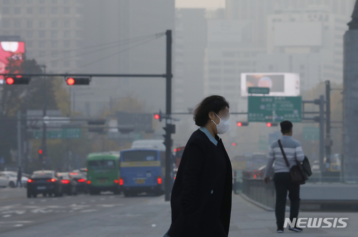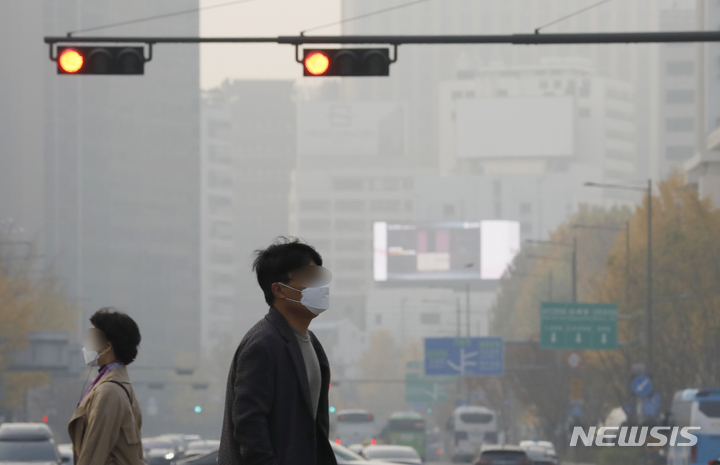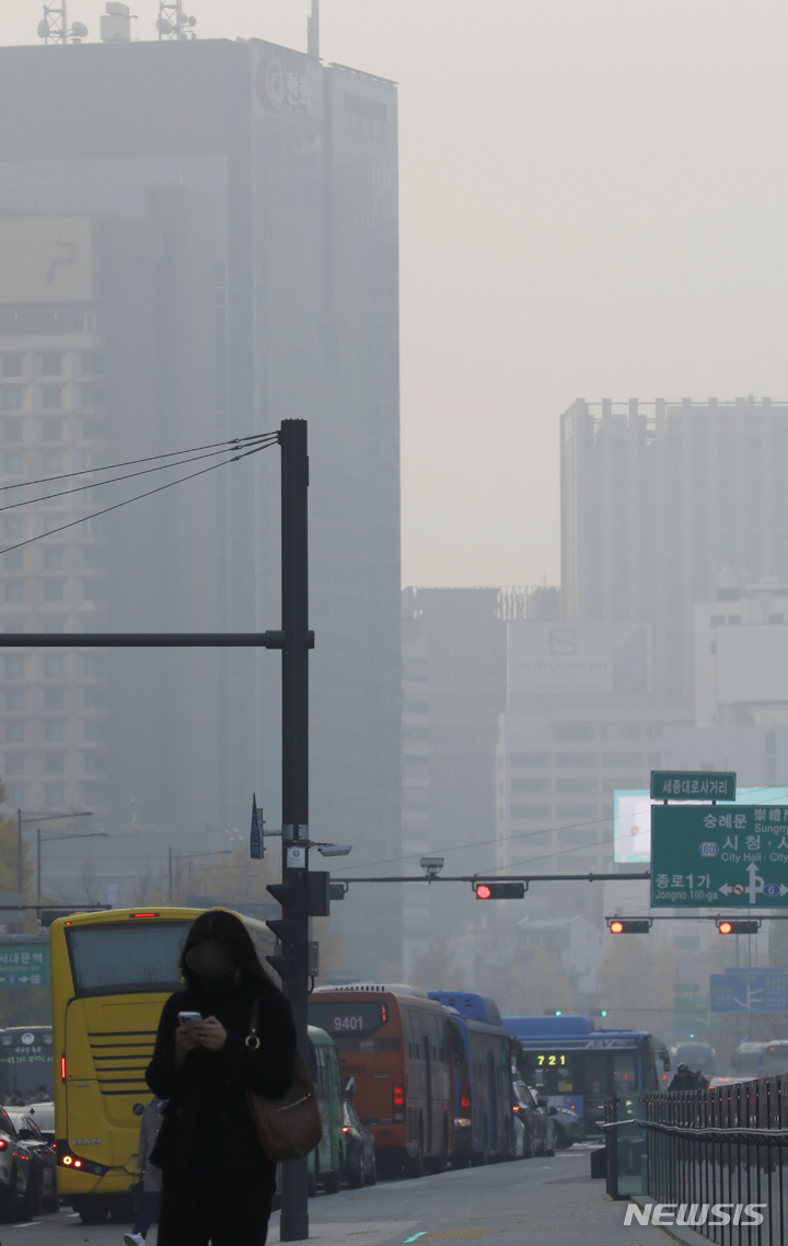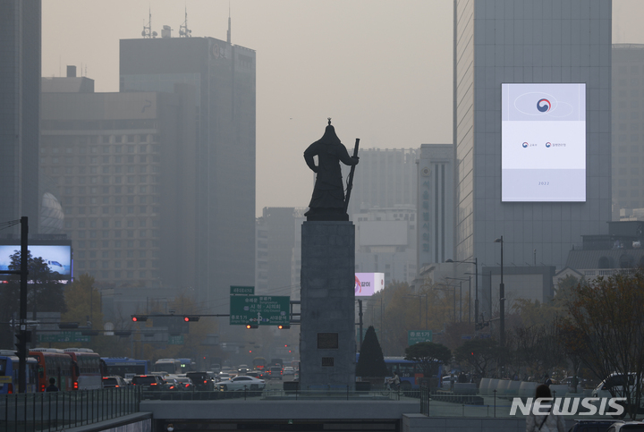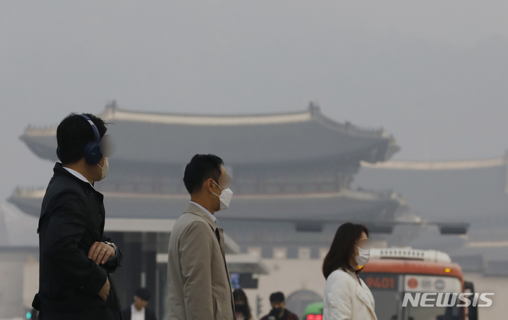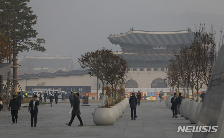 首都圏でPM2.5などの微小粒子状物質の濃度が「不良」レベルとなった10日、ソウル市内の世宗大路一帯は白くかすんでいた。