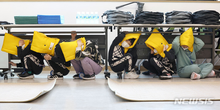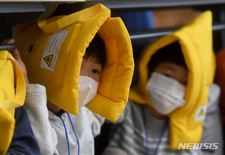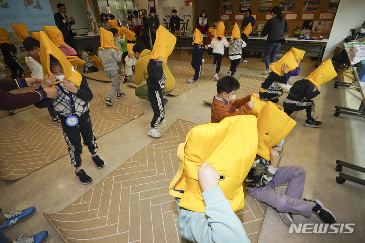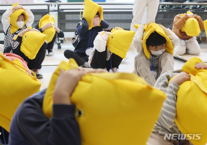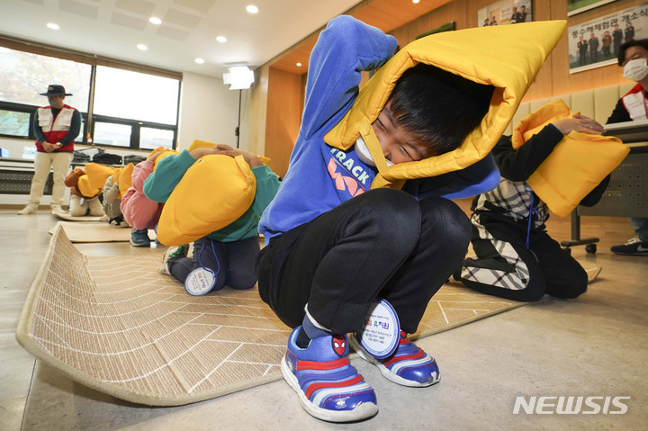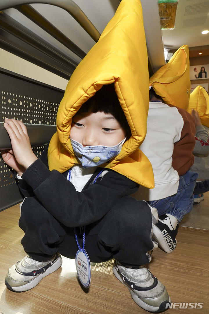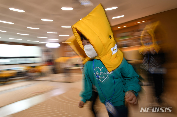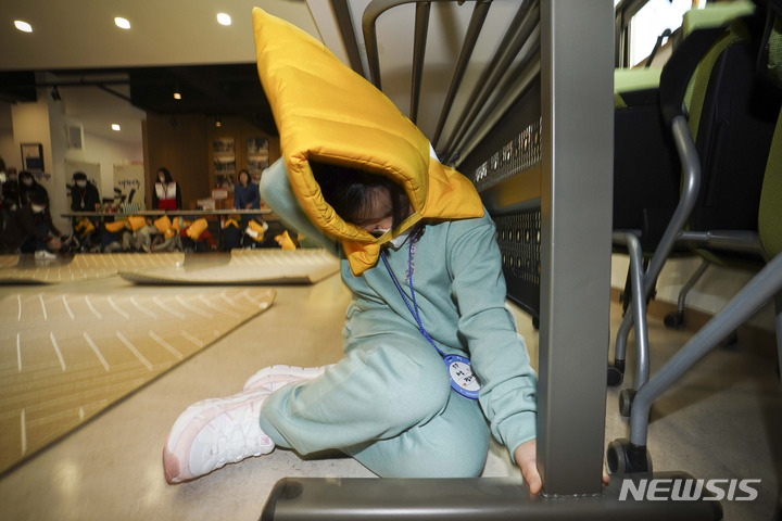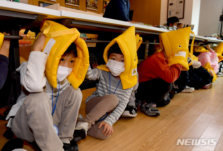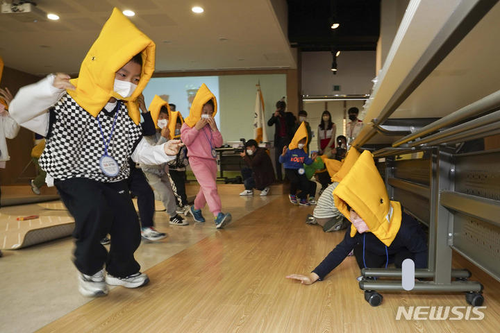 ソウル市麻浦区の希望ブリッジ全国災害救護協会で10日午前、「シェイクアウト・コリア2022」地震対応訓練が行われ、子どもたちが避難訓練に臨んだ。