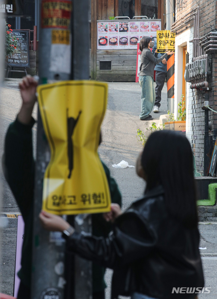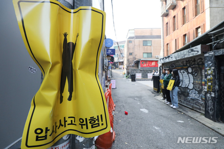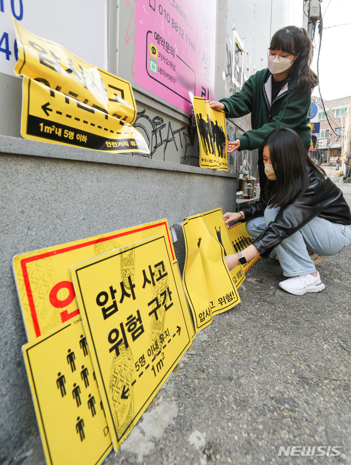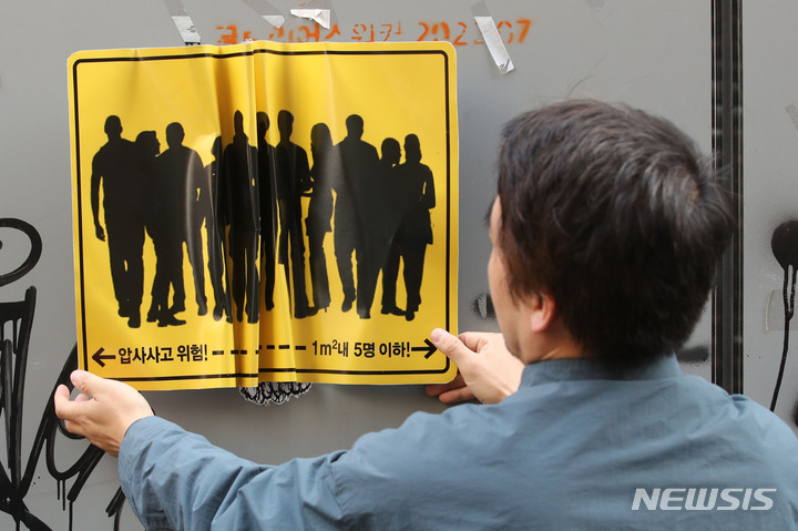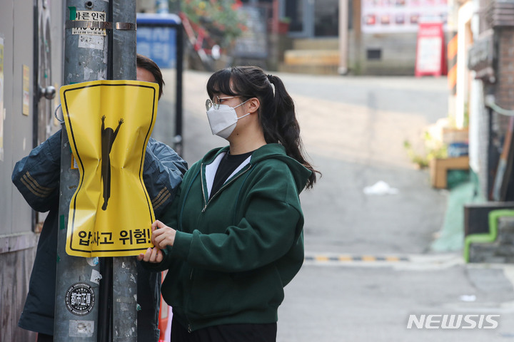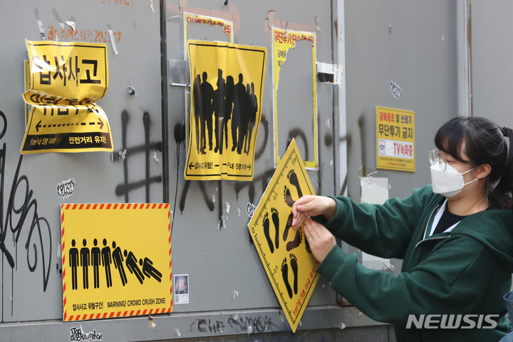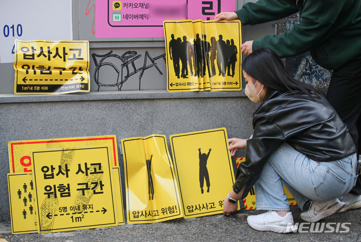 イ・ジェソク広告研究所のイ・ジェソク代表と青年活動家たちが10日午前、ソウル市麻浦区の弘益大学近くで、雑踏事故を予防するための安全表示板の設置を行った。