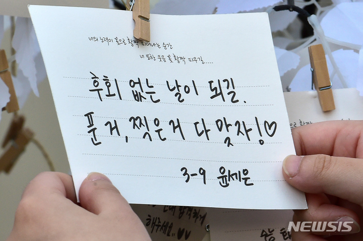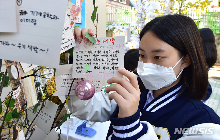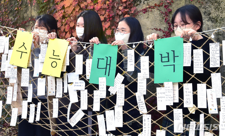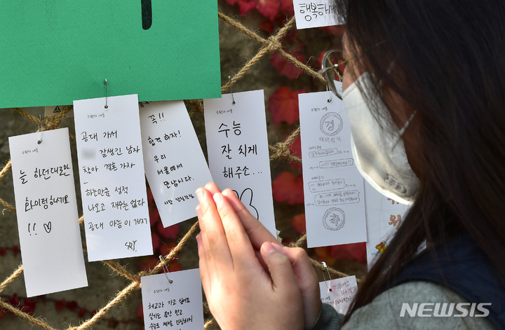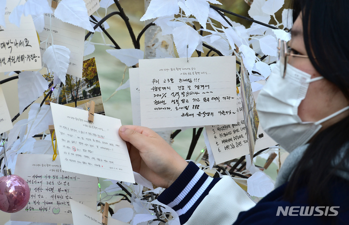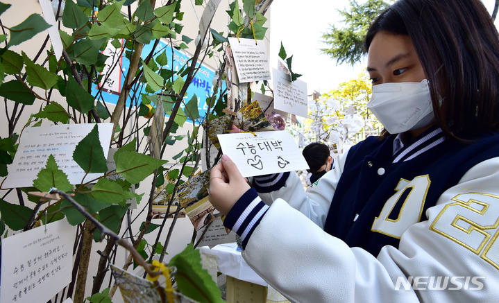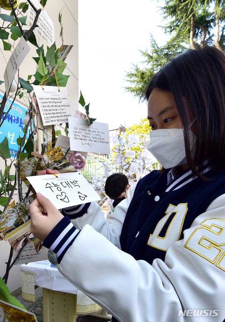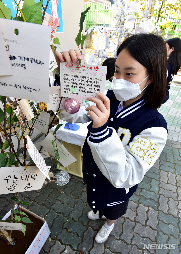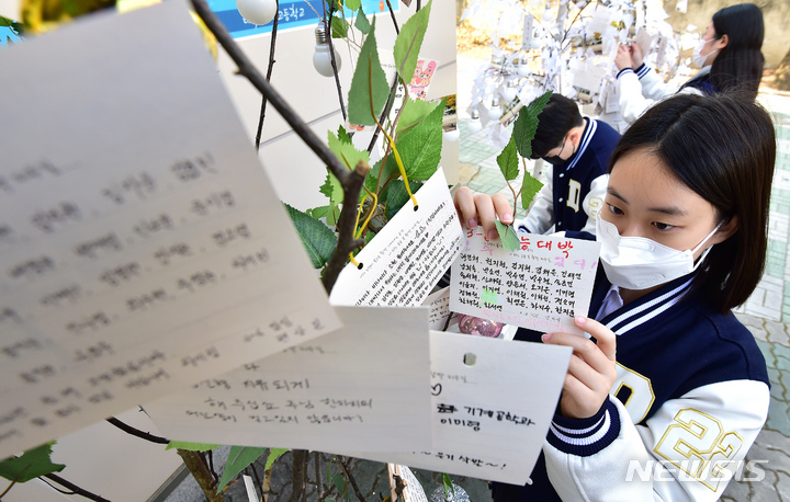 2023年度大学修学能力試験を一週間後に控えた10日午前、大邱市寿城区の大邱女子高校では、2年生たちが構内に設置された「修能高得点祈願応援の木」に、3年生の先輩たちの受験が成功するよう応援するメッセージを掲げていた。