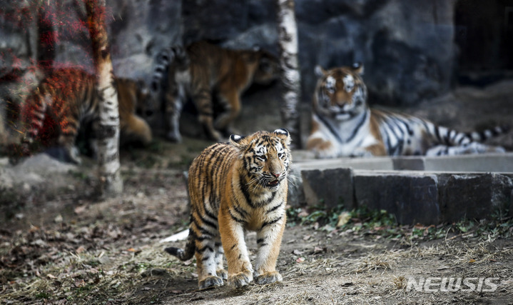 11日午後、京畿道果川市に位置するソウル大公園の猛獣舎で遊び回っている、雌のアムールトラ「ペンザ」と3頭の子どもたち(ヘラン、ペラン、サラン)の様子。