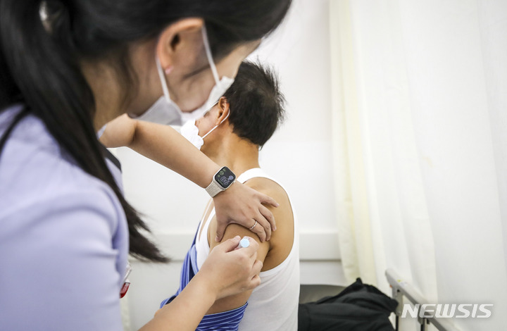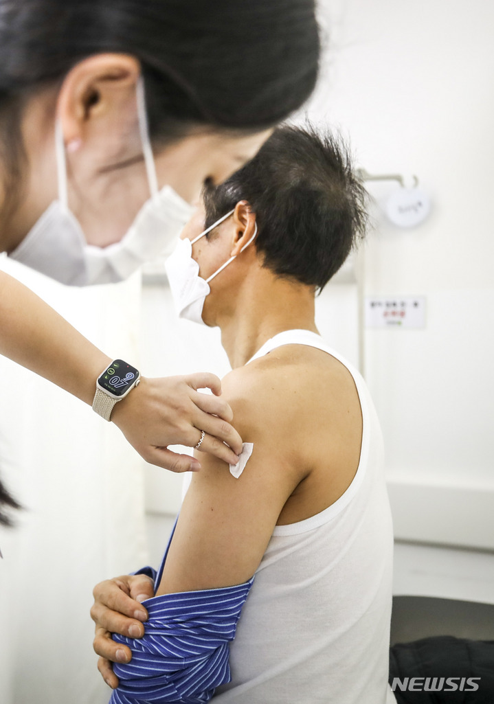 【NEWSIS】14日午前、ソウル市江西区のプミン病院を訪れ、新型コロナウイルスのワクチン接種を受ける人。先月27日から事前予約した18歳以上の接種者を対象に、オミクロン株BA.4とBA.5対応のファイザー製ワクチン接種が始まった。