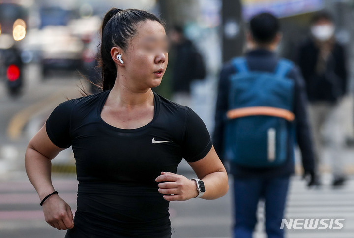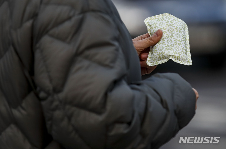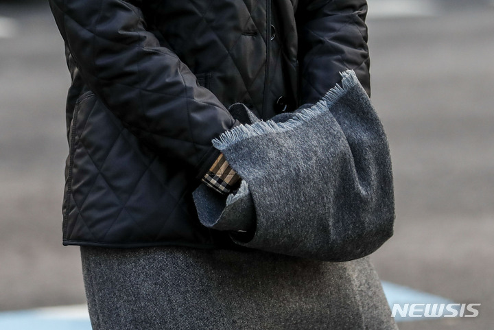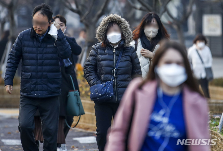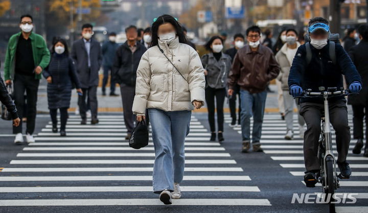 ソウル市鍾路区の世宗路交差点では16日、厚着をして行き交う市民たちの姿が見られた。