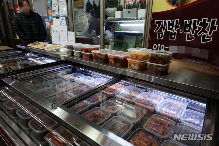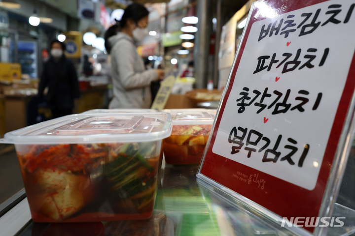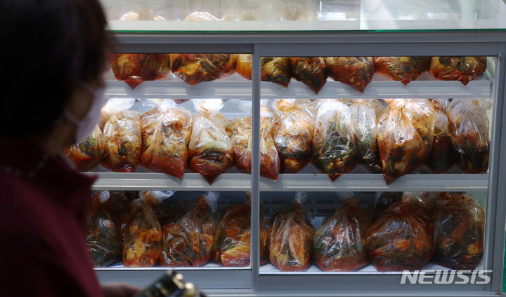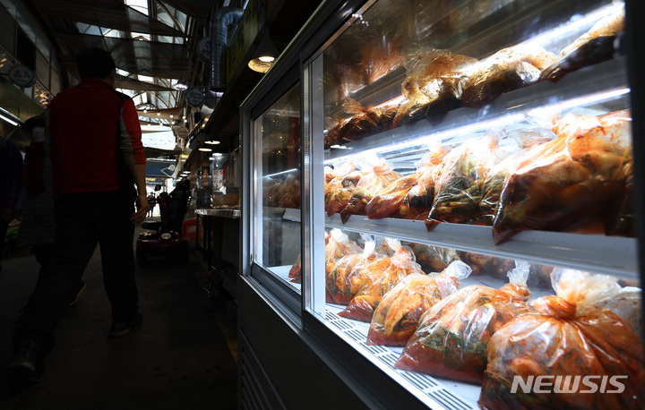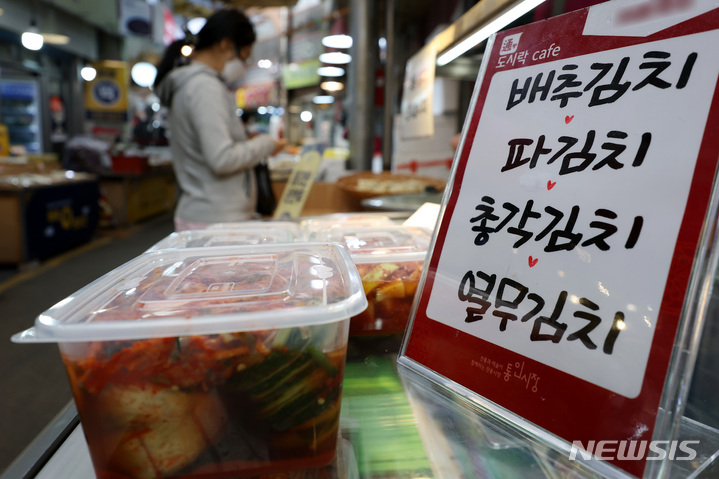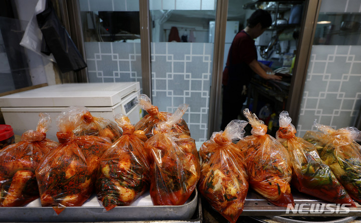 ソウル市鍾路区の通仁市場の惣菜店で16日午前、キムチを販売している様子。この日発表された関税庁の貿易統計によると、10月の韓国のキムチ輸入額は前年同月に比べ50.9%増の1701万8000ドルだという。これは歴代最高額で、1カ月基準で1700万ドルを超えたのは初めてだ。