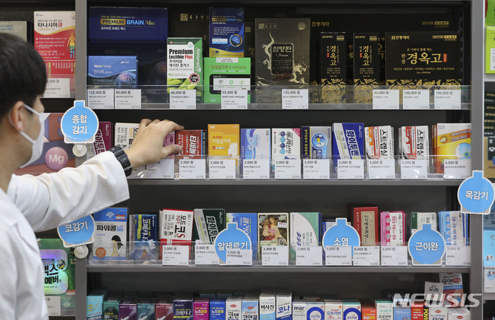 ソウル市内の薬局で18日午前、従業員が風邪薬を整理しているところ。新型コロナの再拡大や季節性インフルエンザの流行などに伴う風邪薬不足が懸念される中、韓国政府は、製薬業界の要求を受け入れて薬価の引き上げを進めることを明らかにした。