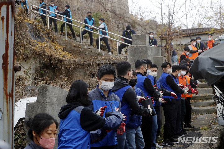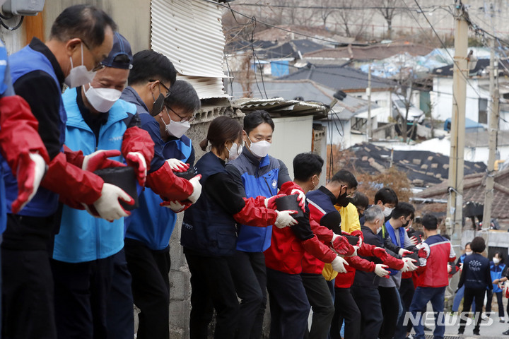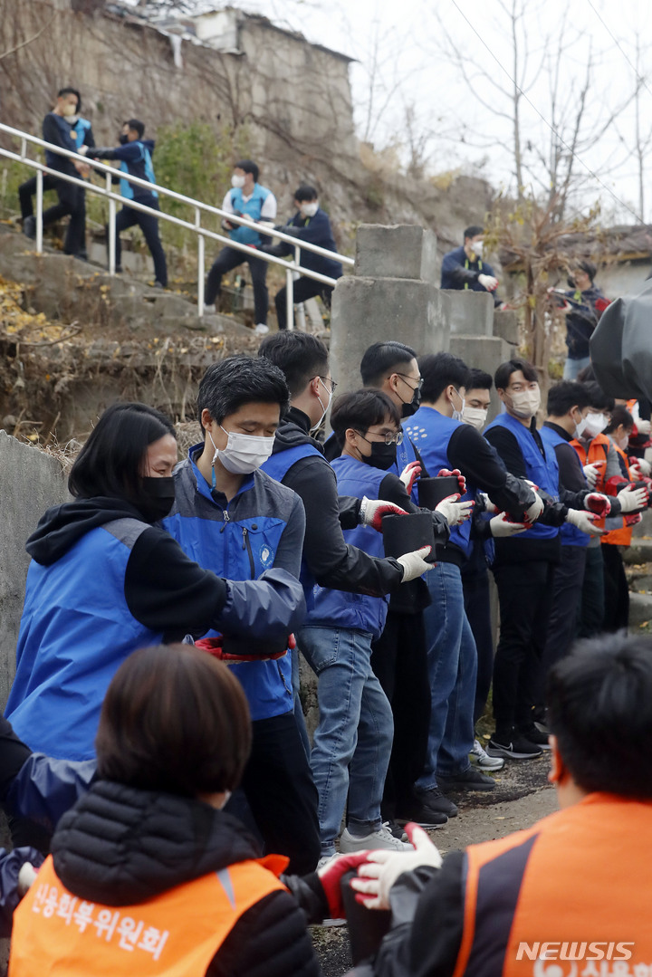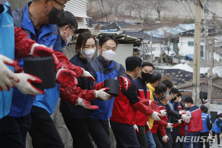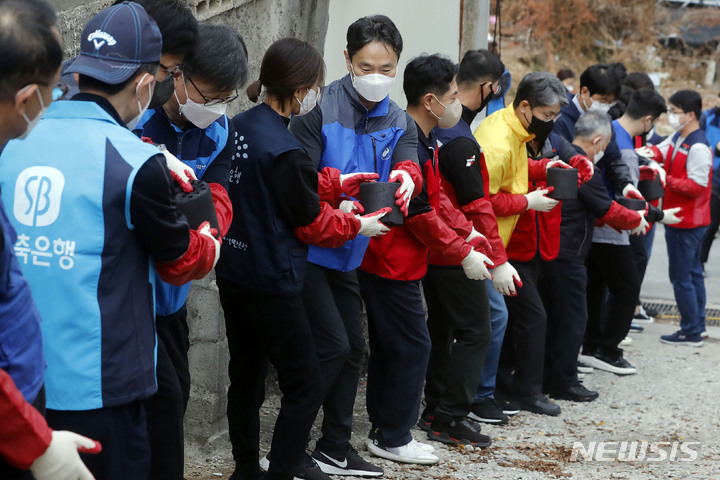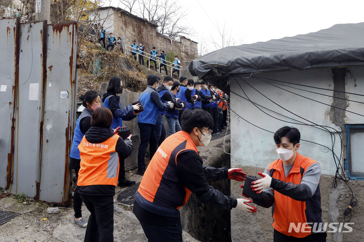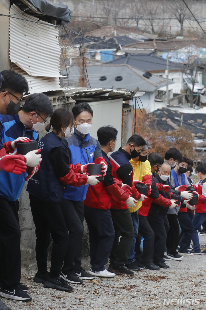 ソウル市芦原区のペクサ村で21日、金融業に従事する人々が合同練炭分かち合いボランティアを行っている様子。