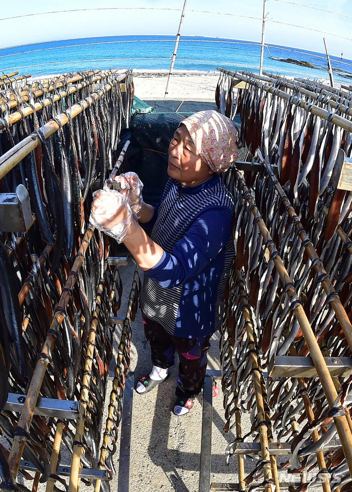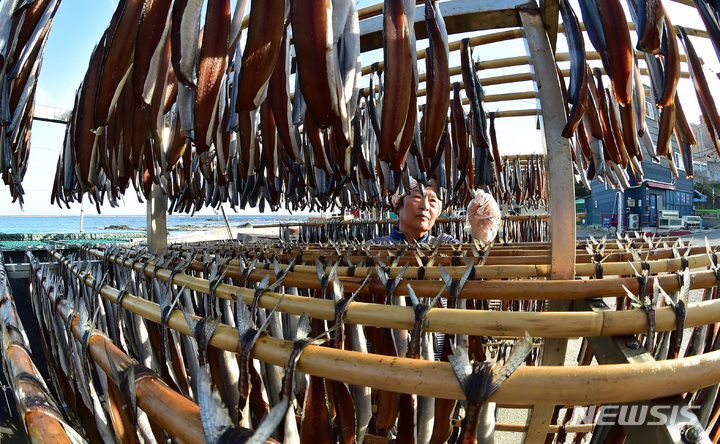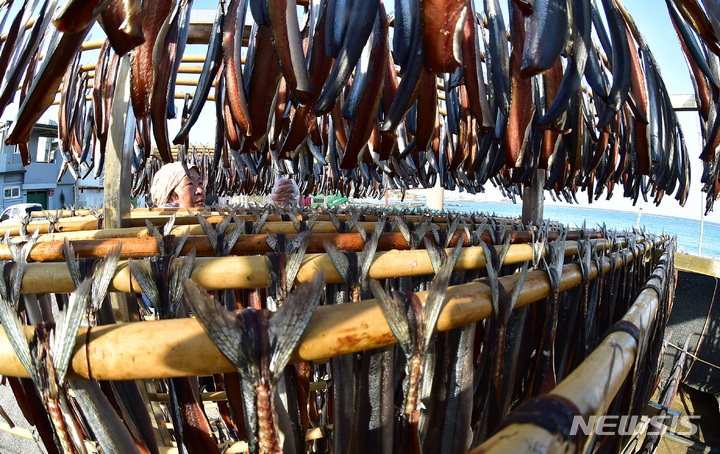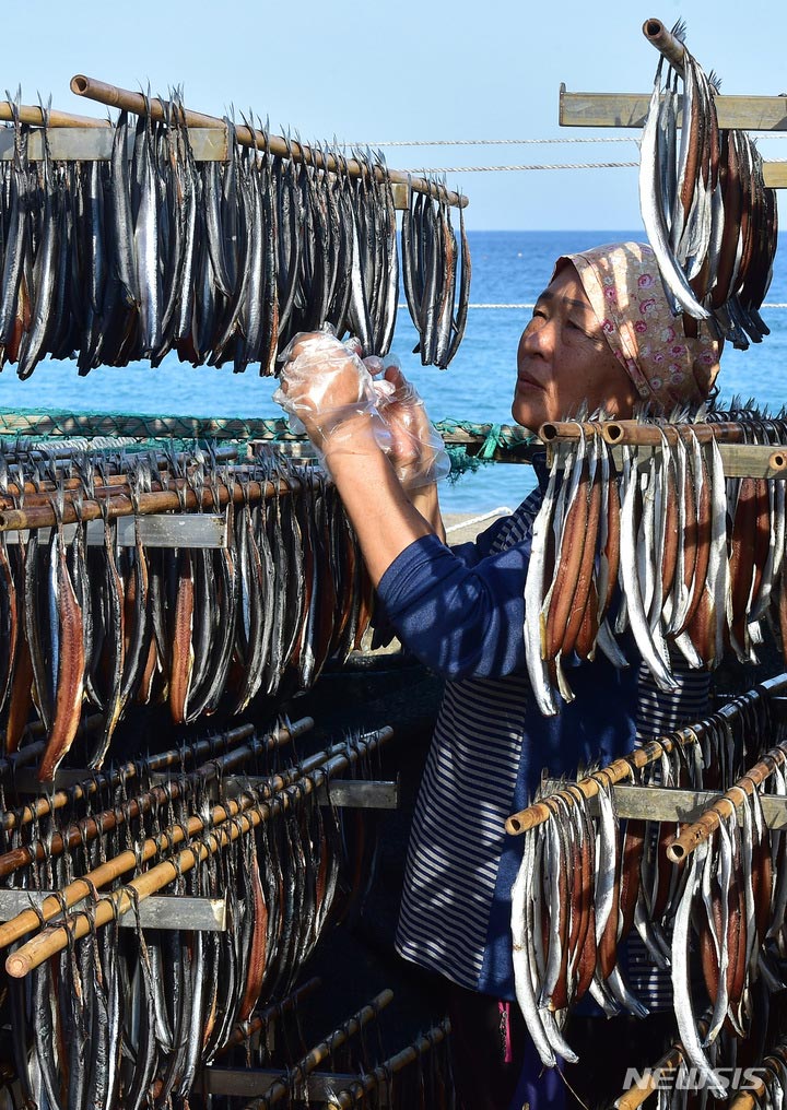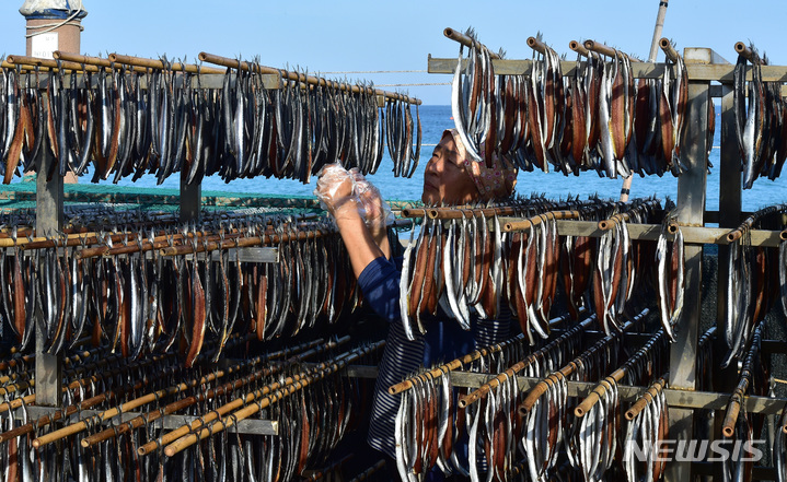 浦項の代表的な特産物、干しサンマの季節を迎えた21日午後、慶尚北道浦項市南区九竜浦邑虎尾路の海岸でサンマを干している漁業関係者。