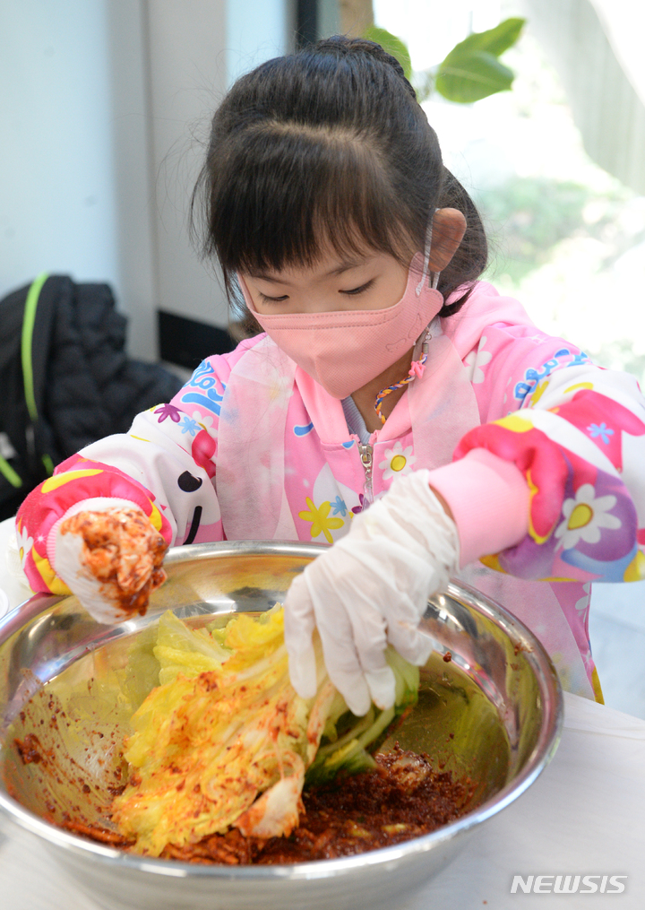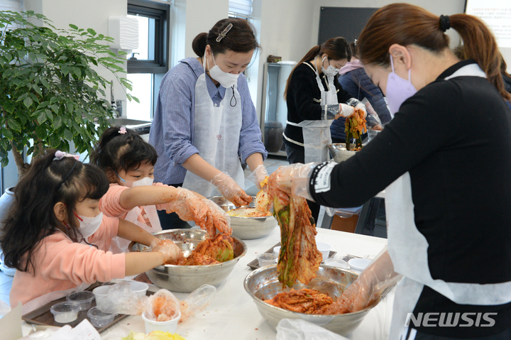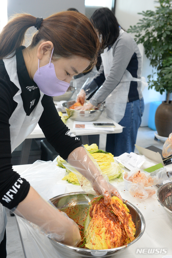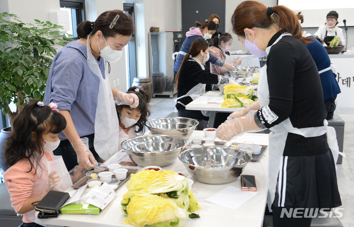 ロッテINEOS化学(チョン・スンウォン代表)が26日午前、蔚州郡甕器村の発酵アカデミーで、蔚山に居住する多文化家庭を招いてキムジャン漬け込み体験イベントを行った。