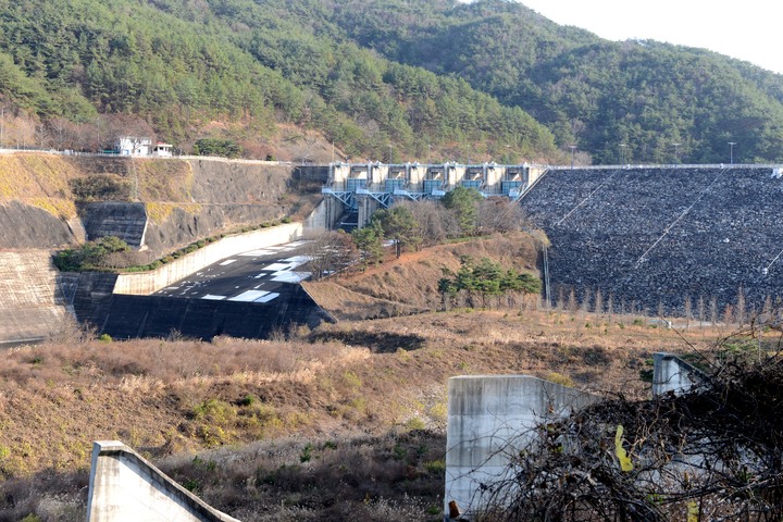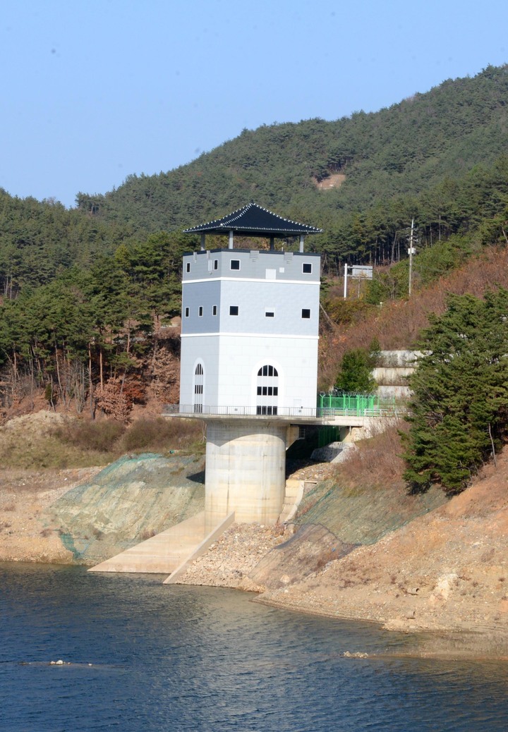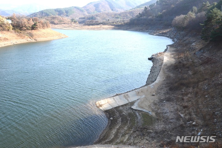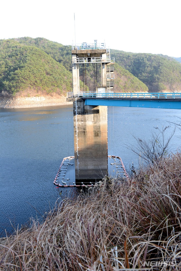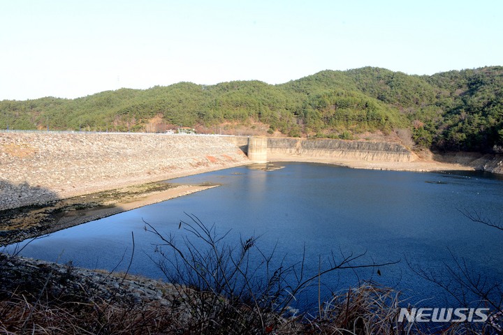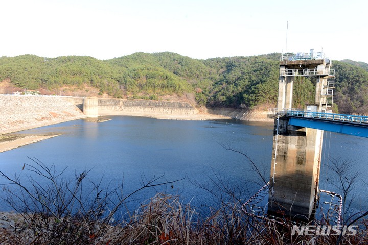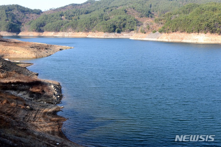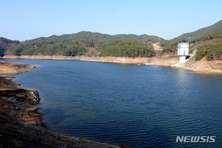 26日午後、光州・全羅南道地域の上水源で麗水国家産業団地の工業用水源となっている住岩ダムの貯水率が31%台にとどまり、水位が急減する中、右側の取水塔の柱が露出している様子。