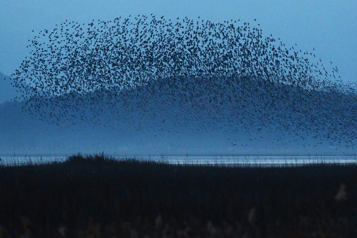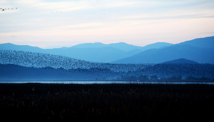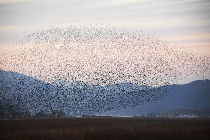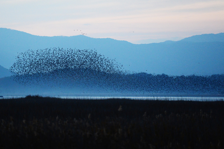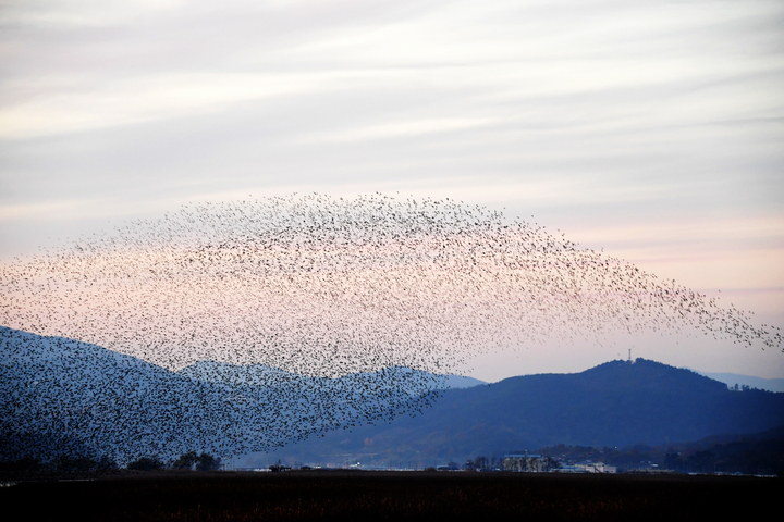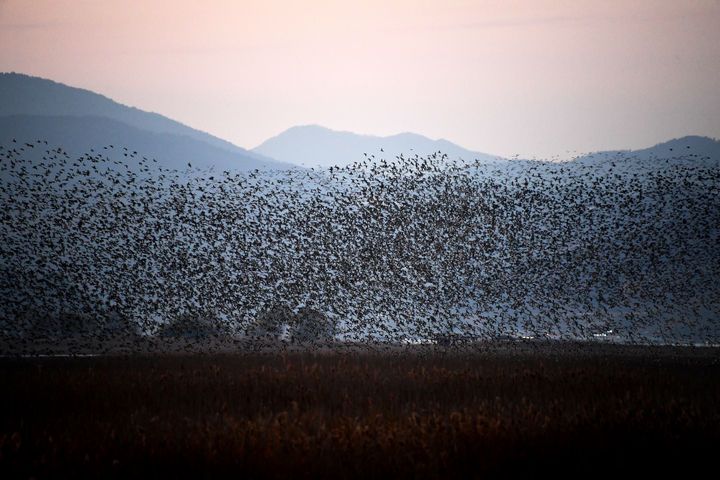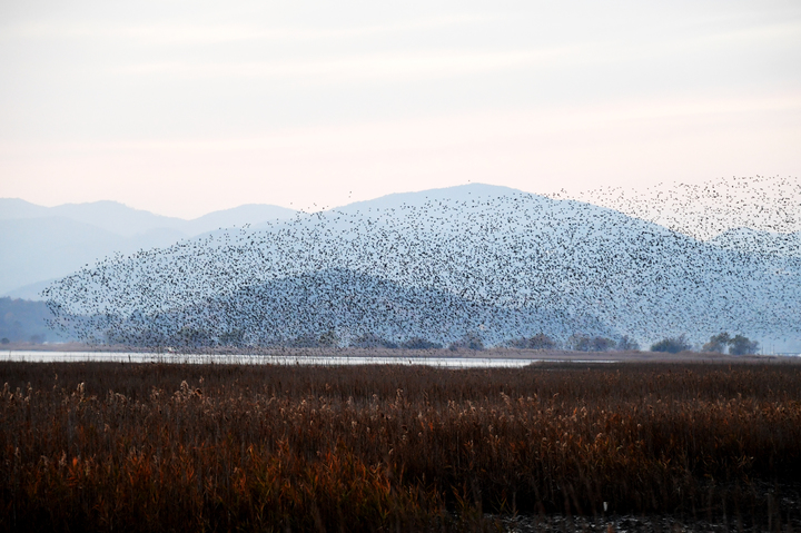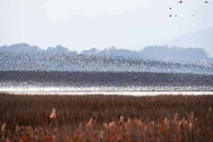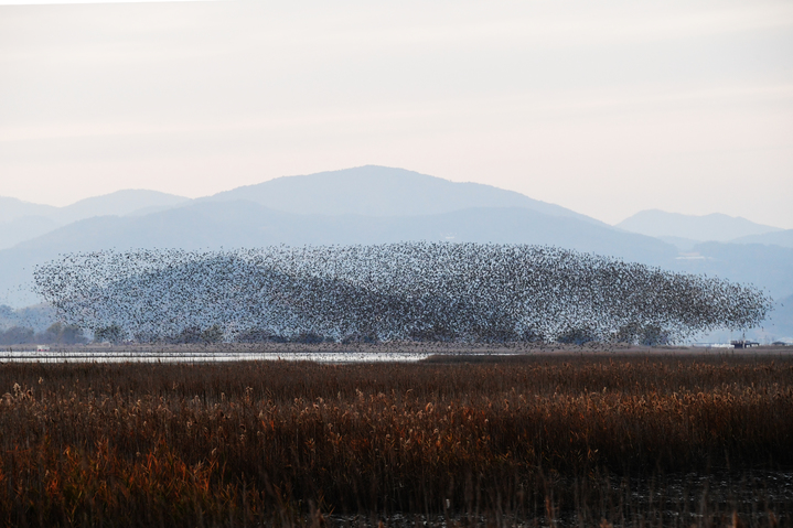 25日午後、全羅南道の順天湾では数万羽のトモエガモが干潟の上を飛び、群舞を繰り広げていた。