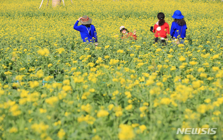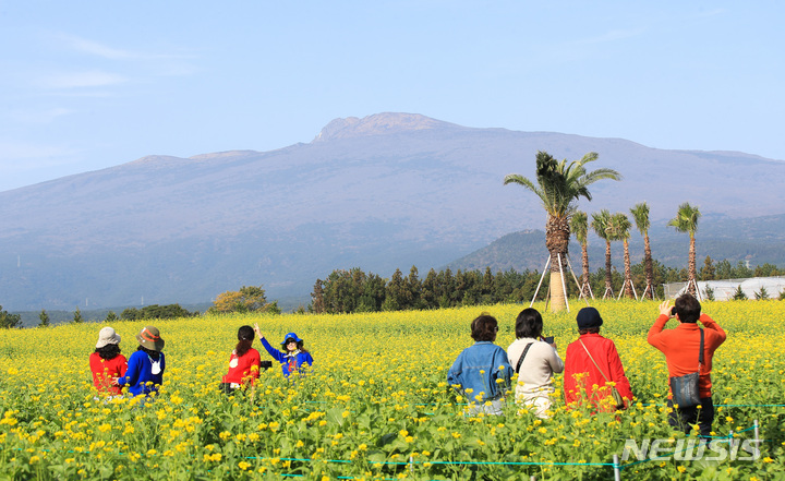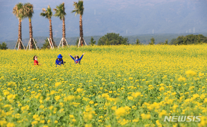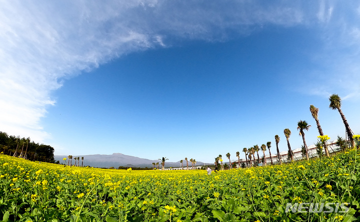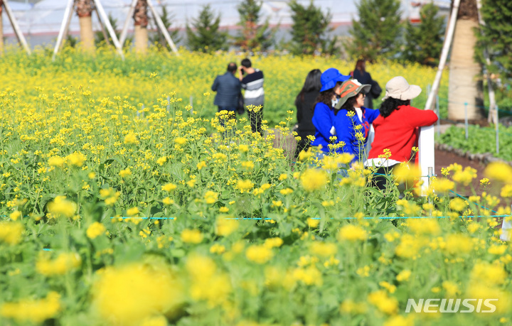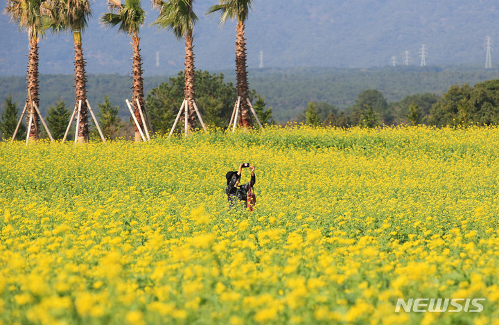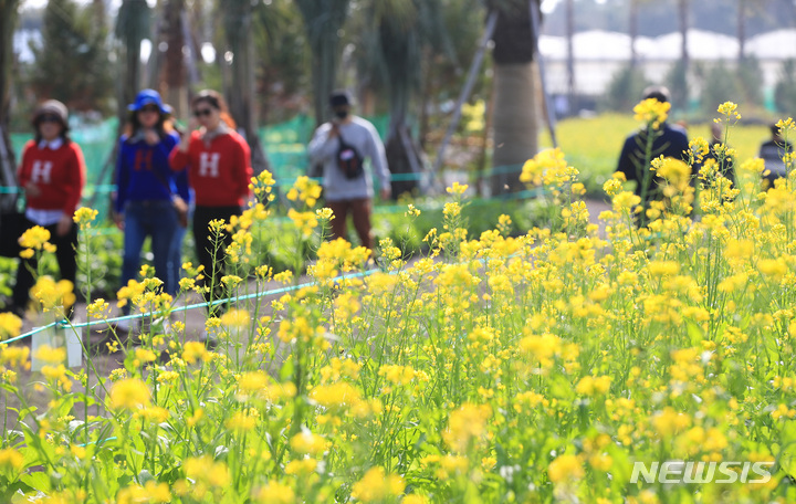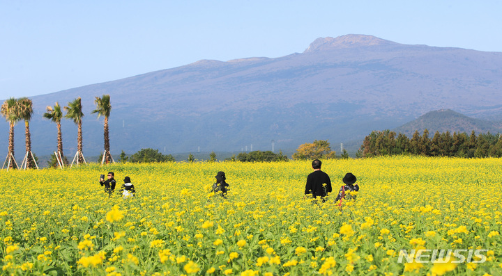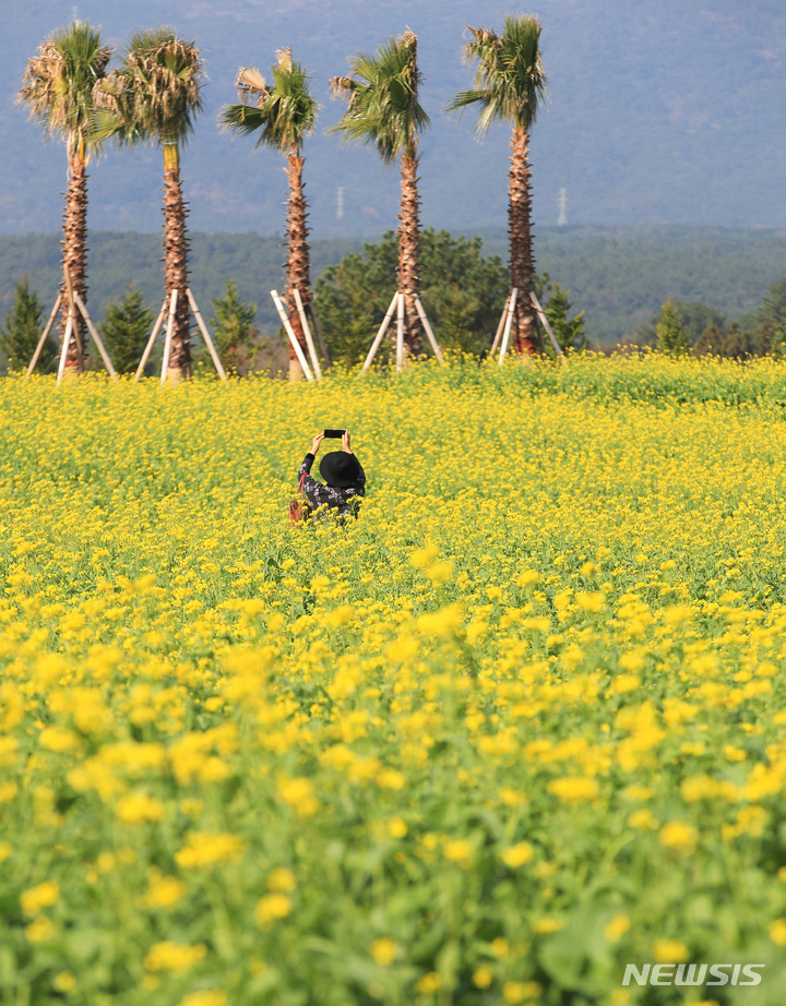 【NEWSIS】全国的に気温が大幅に下がった27日午前、済州特別自治道西帰浦市の休愛里(ヒュエリ)農場では「春の花」菜の花が満開になり、趣を異にしていた。気象庁によると、28日は済州島をはじめ全国で雨が降った後、最低気温が氷点下まで下がるとのことだ。