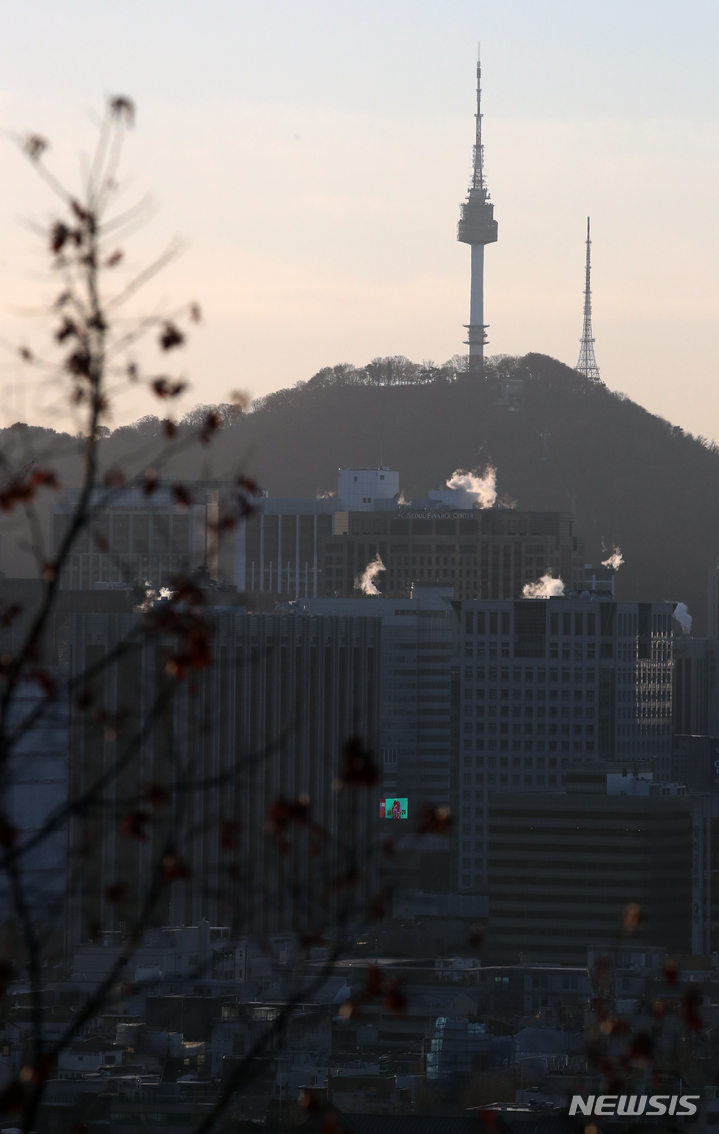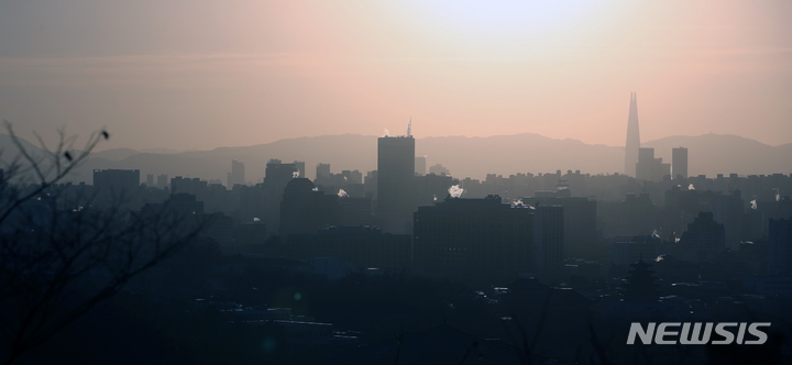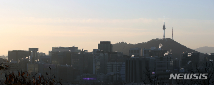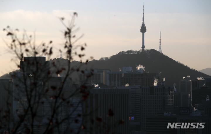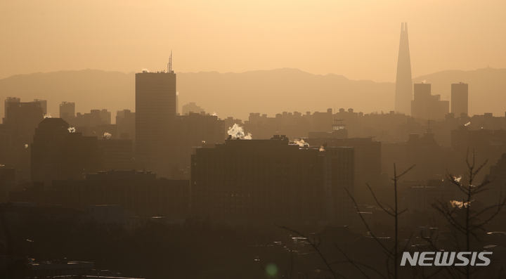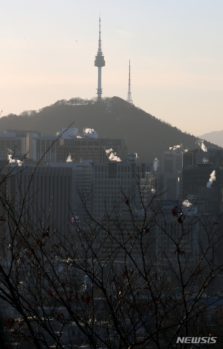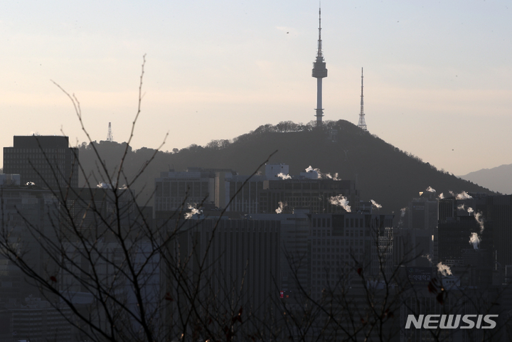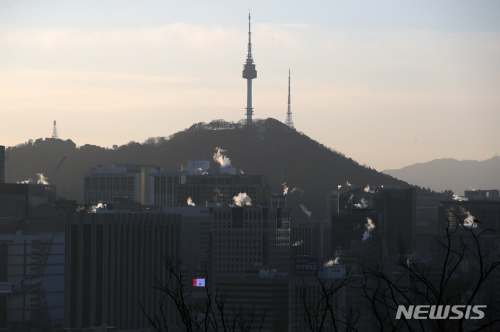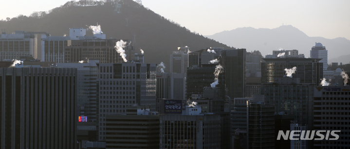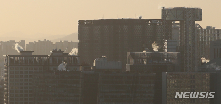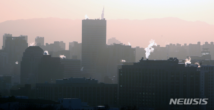 【NEWSIS】全国ほとんどの地域に寒波警報が発令された30日、ソウル市内のビルからは暖房に伴う蒸気が上がっていた。