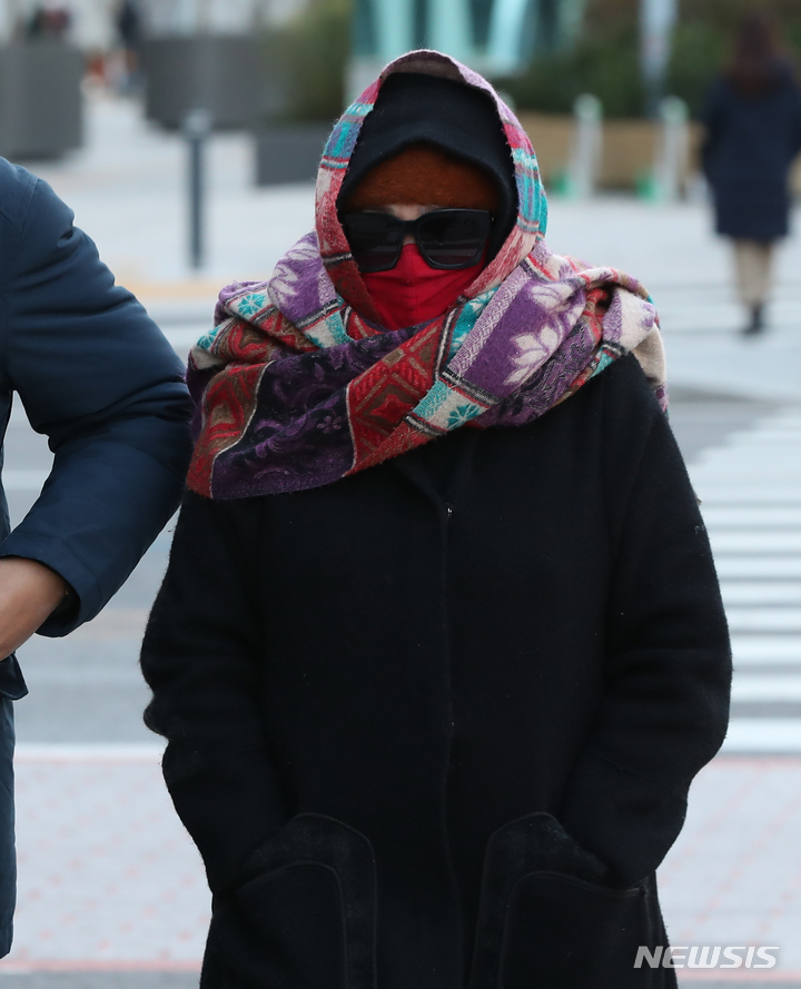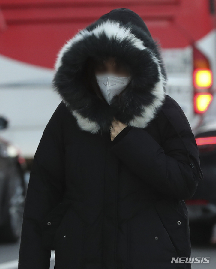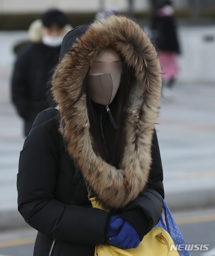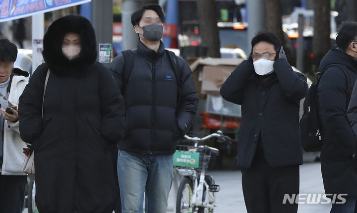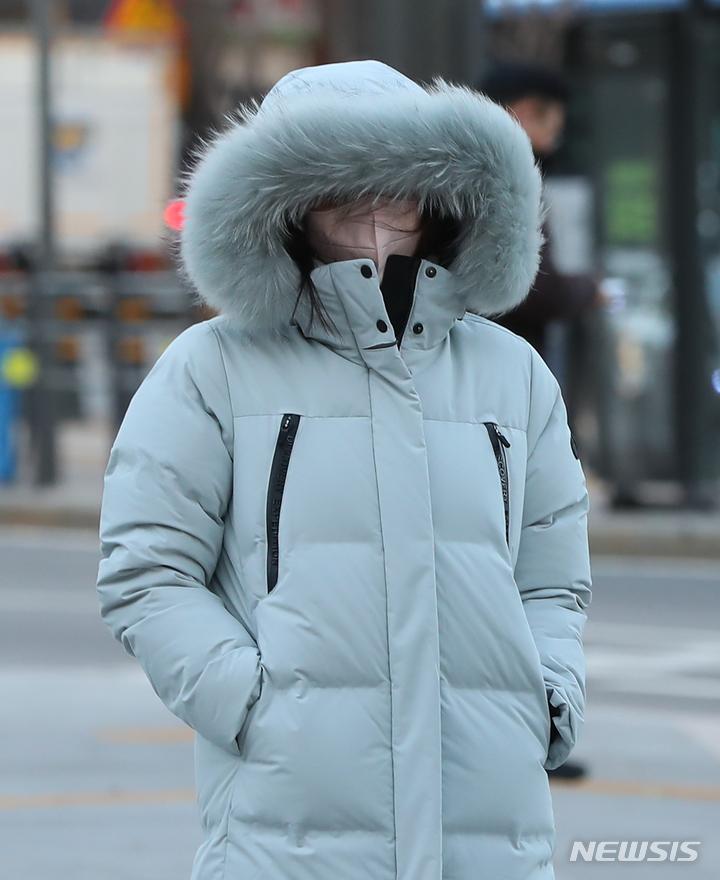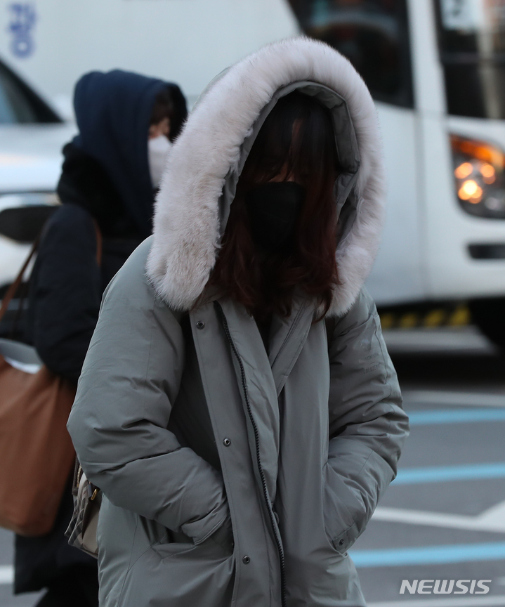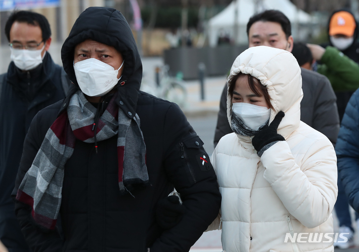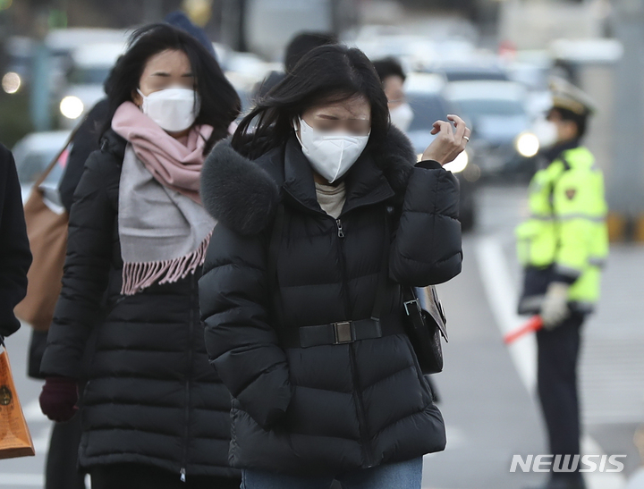 【NEWSIS】首都圏地域に寒波特報が下された30日午前、ソウル市鍾路区の世宗大路近くで、厚手のコートをしっかり着込み出勤する人々。