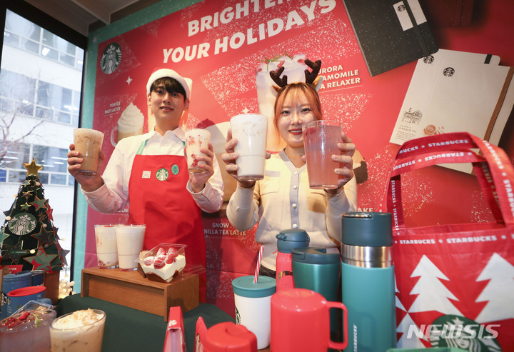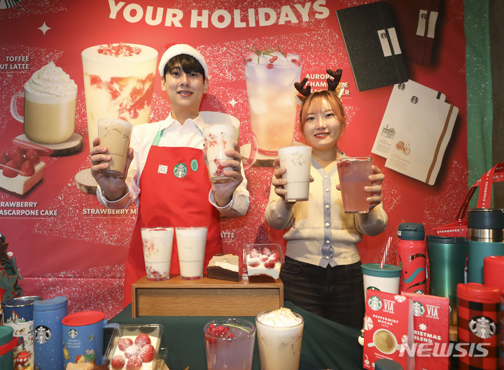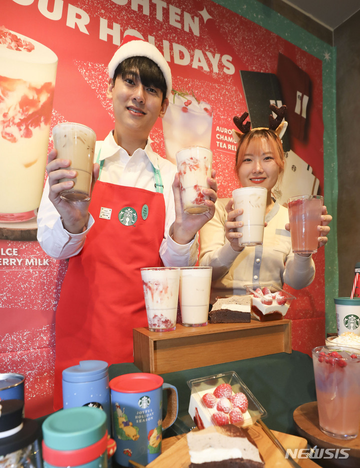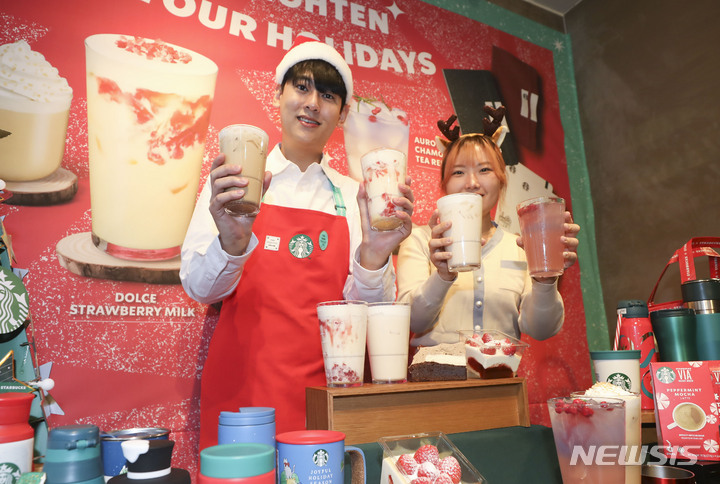 ソウル市中区のスターバックス・プレスセンター店で1日午前、「スターバックス・スノー・バニラ・ティーラテ」や「ドルチェ・ストロベリーラテ」など、冬の新作ドリンク発売記念イベントが行われ、コンパニオンらがドリンクをPRした。