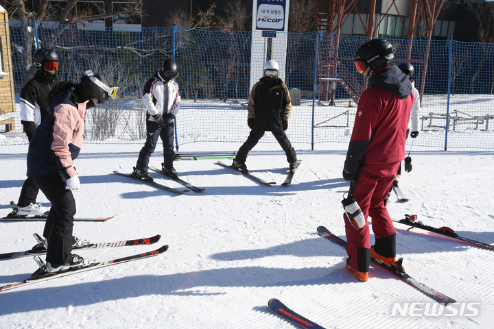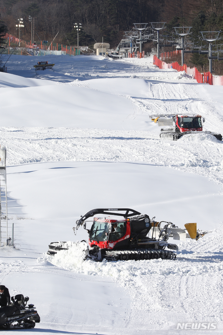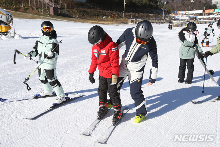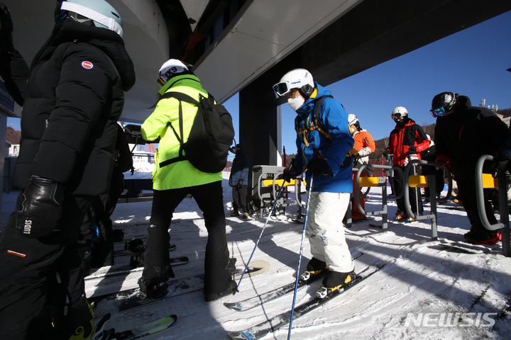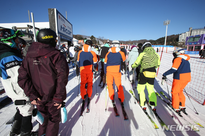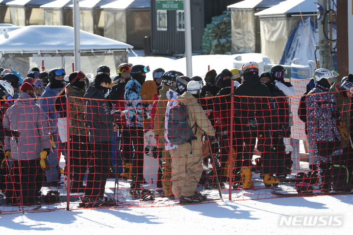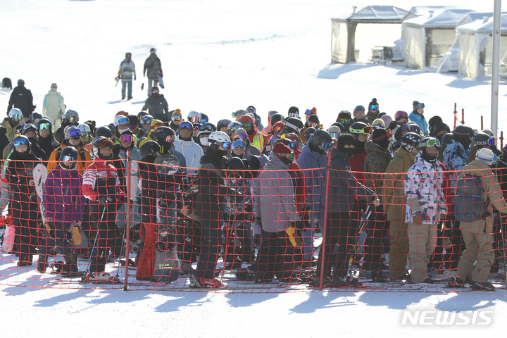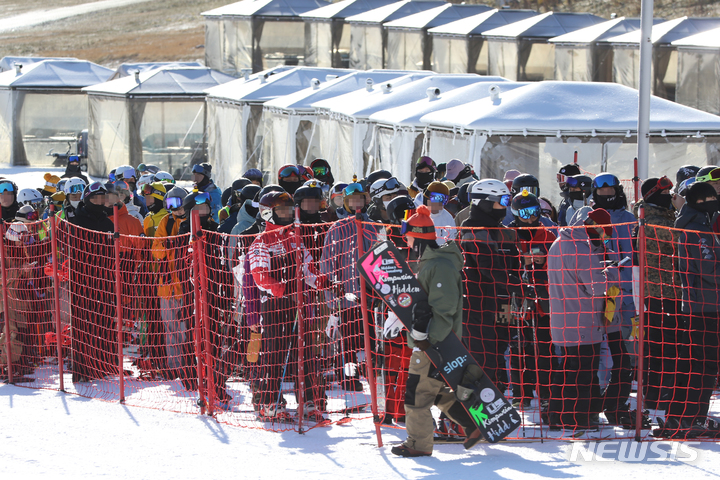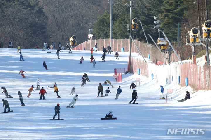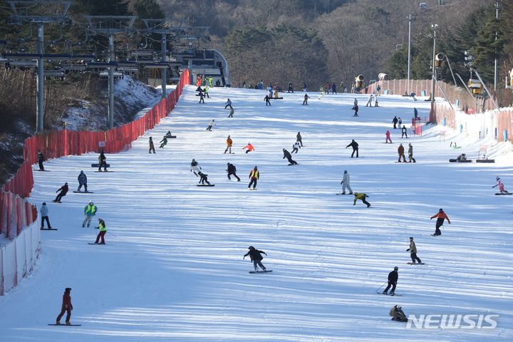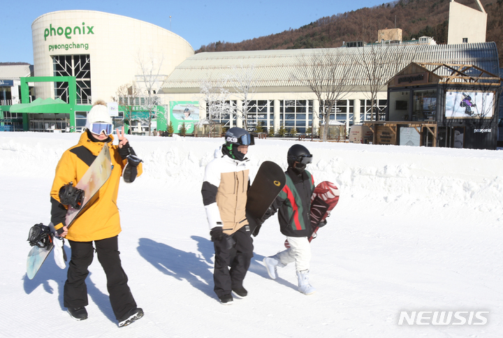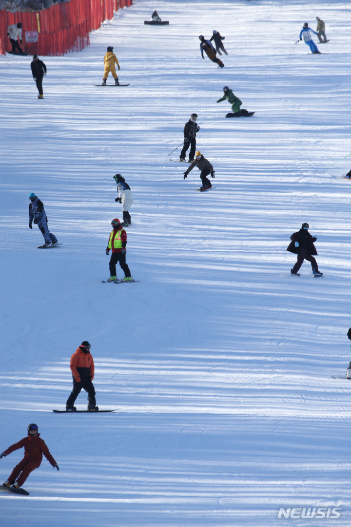 スキー場のオープン日に当たる2日午前、スキーヤーやスノーボーダーたちが江原道平昌郡のフェニックス平昌スキー場で、斜面を滑りながら冬のスポーツの楽しさを満喫していた。