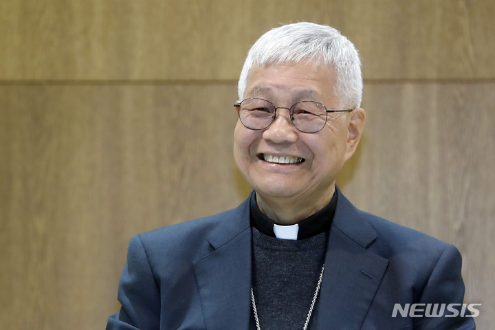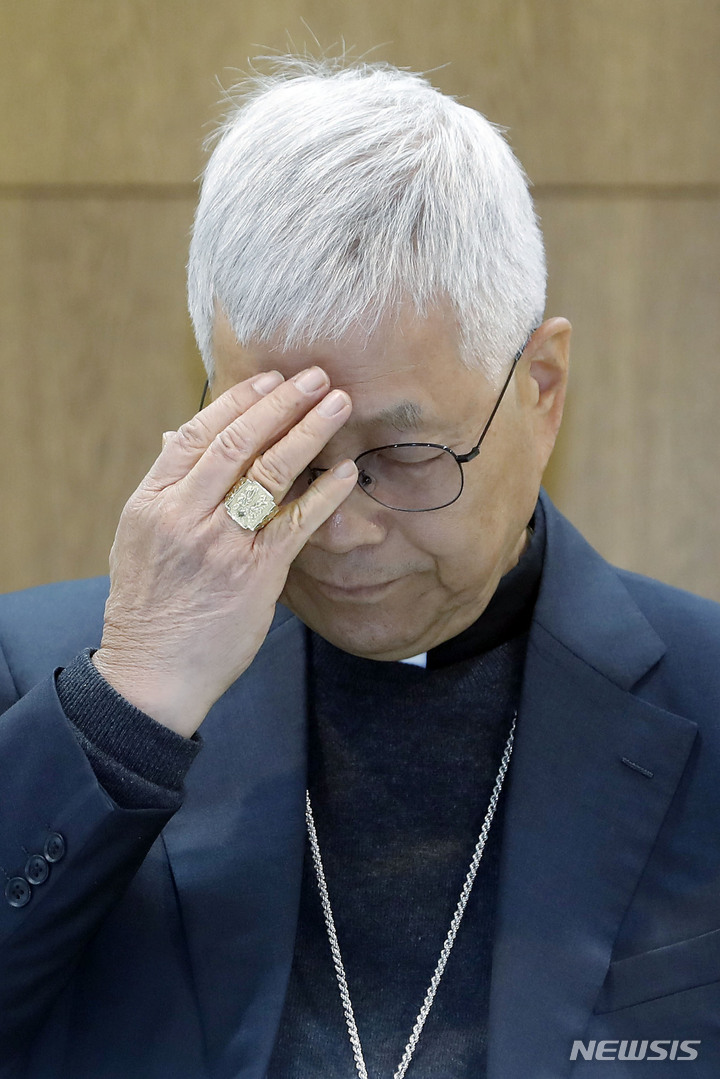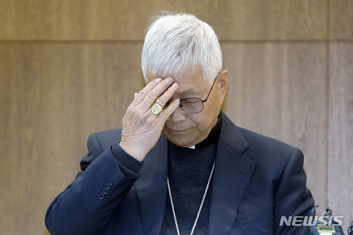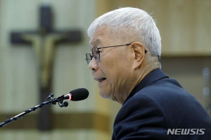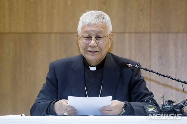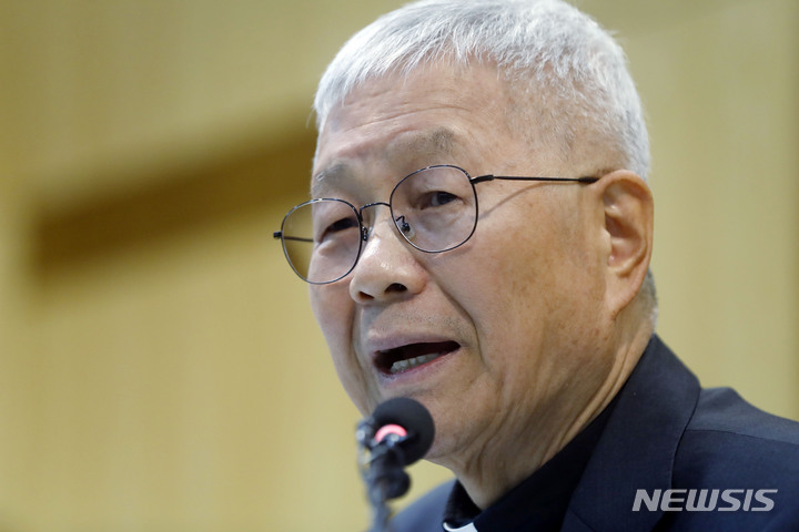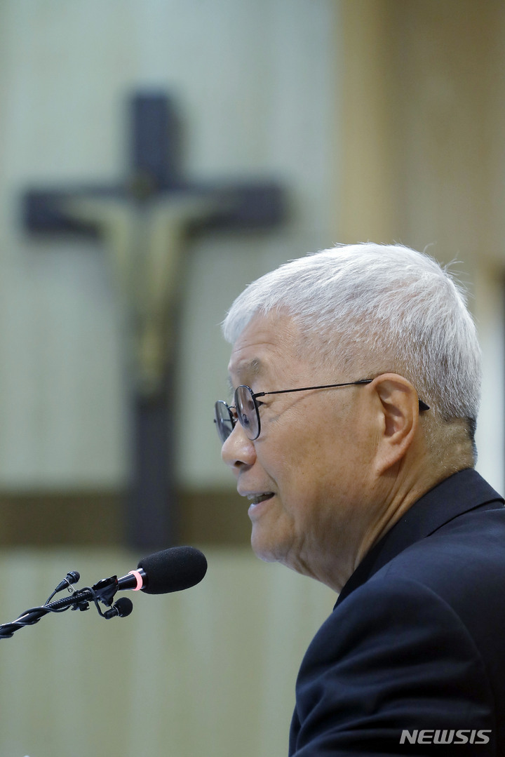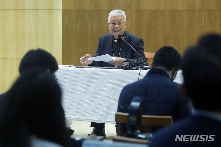 教皇庁聖職者省長官の兪興植(ユ・フンシク)枢機卿が2日、ソウル市中谷洞の韓国天主教中央協議会で記者会見を行っている様子。