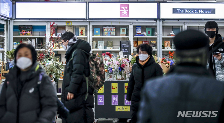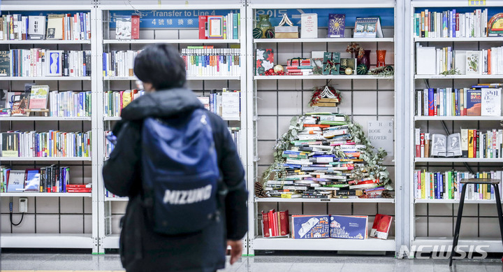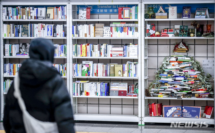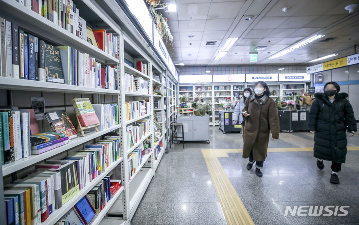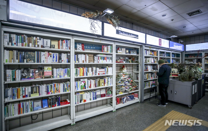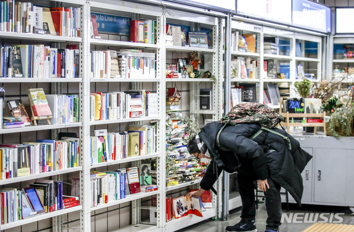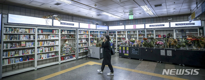 6日、ソウル市竜山区内の三角地駅にあるハヌリ文庫前を移動する市民たち。ソウル交通公社は、地下鉄の駅舎内にある書店との契約を延長しないことを発表した。契約は今月9日に満了となる。1986年、地下鉄内に文化空間を設けるという趣旨で登場した地下鉄書店は、今回の決定により、36年の歴史に幕を下ろし、消えることになった。