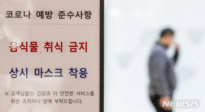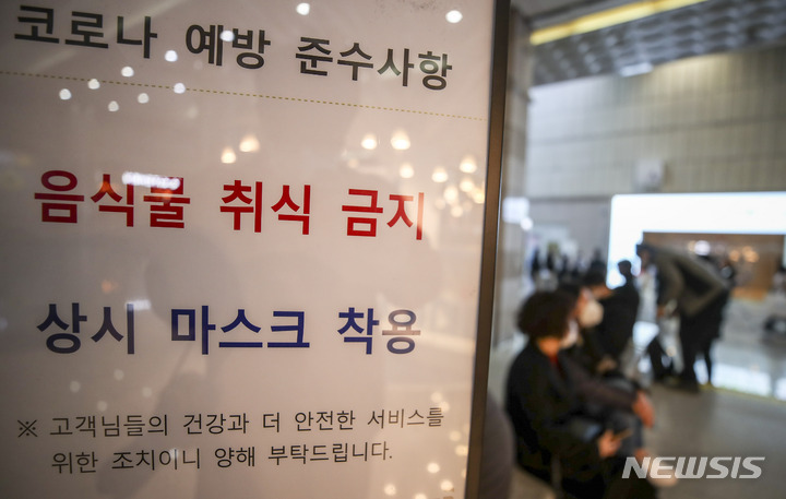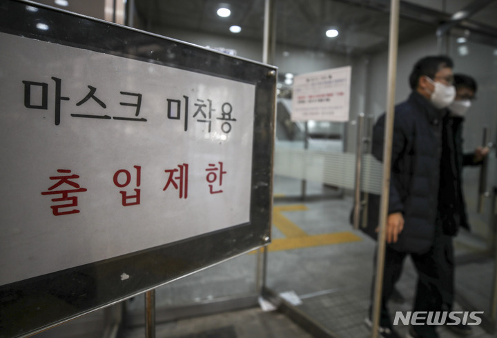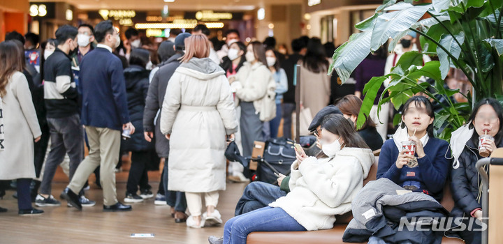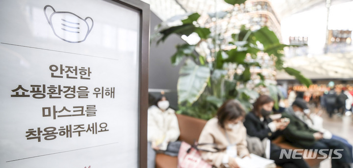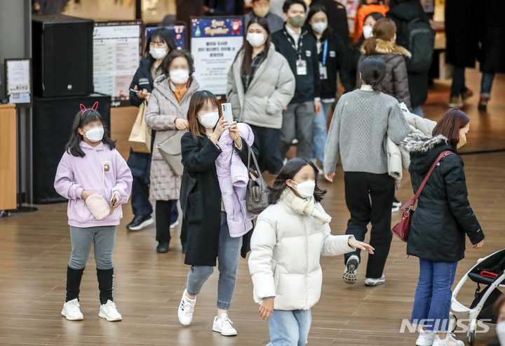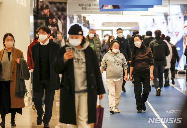 ソウル市内のある大手ショッピングモールで7日午後、マスクを着けた姿で行き交う市民の様子。韓国政府は、今月末までに室内マスク着用義務の緩和調整案を決定することとした。