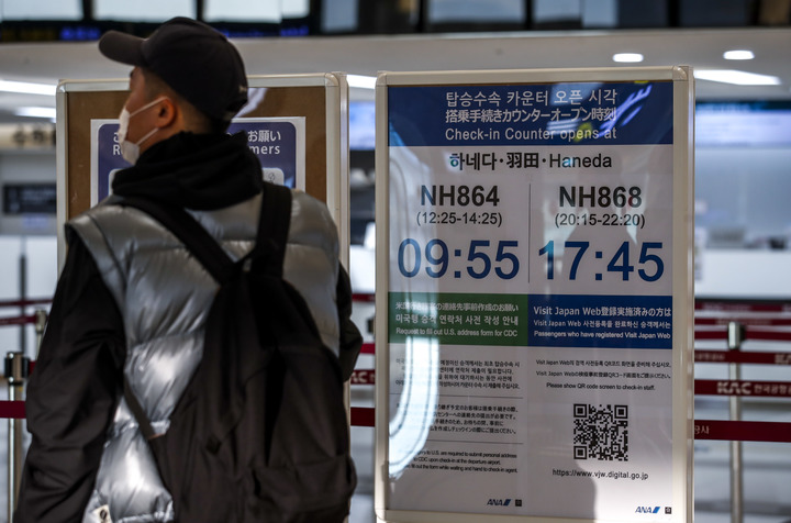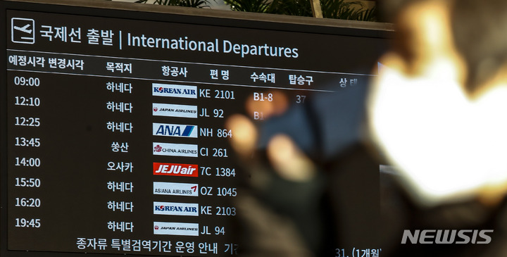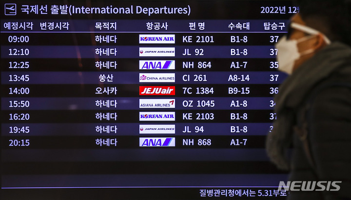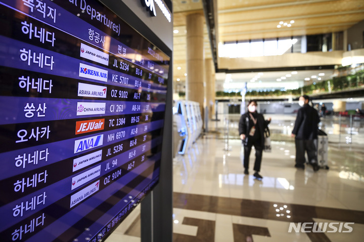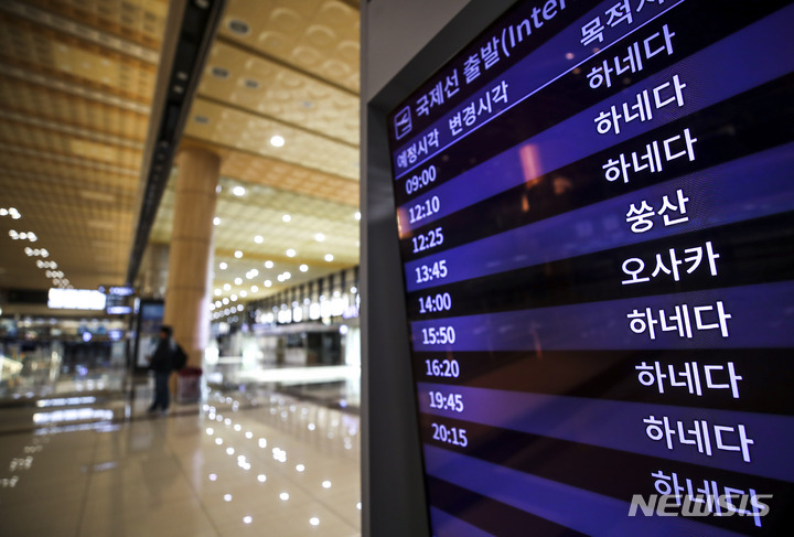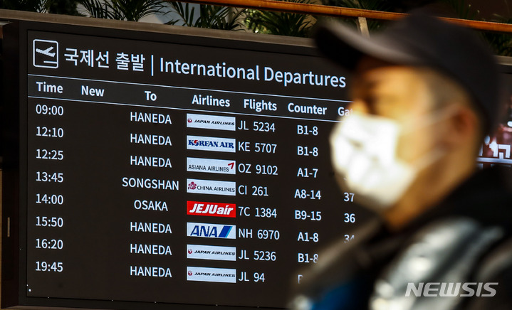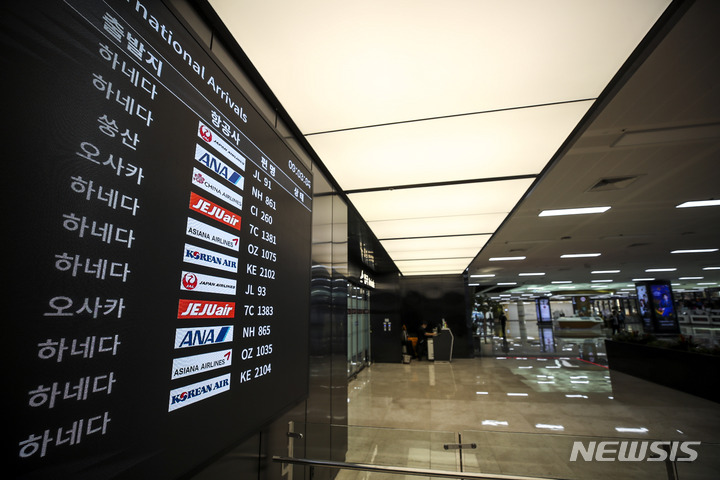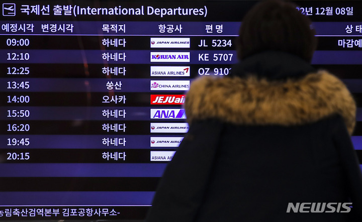 8日午前、ソウル市江西区の金浦国際空港国際線出国ロビーの電光掲示板に、国際線の出発情報が表示されている。金浦-羽田線の運航便数が近いうちにコロナ禍前の水準に回復する見通しだ。国土交通部(省に相当)は、金浦-羽田線の運航便数がこれまでの週56便から84便に増えると発表した。