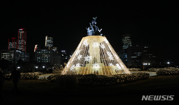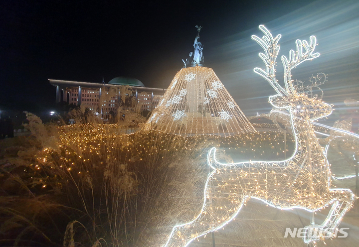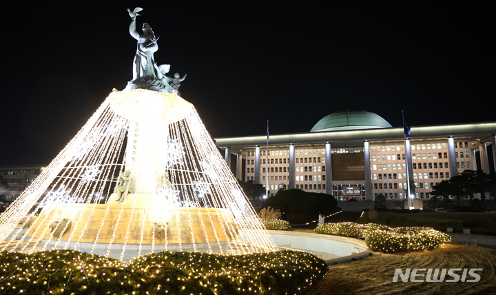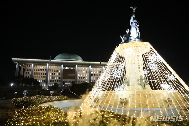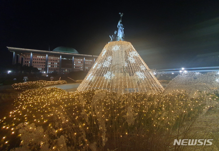2022年国会クリスマスツリー点灯式が行われた7日午後、ソウル市永登浦区汝矣島洞の国会前にある噴水広場に設置されたツリーが夜空を明るく照らしていた。