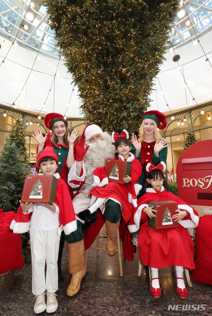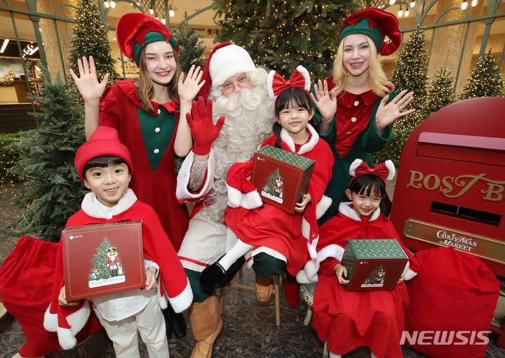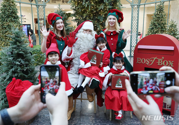 ソウル市中区のロッテデパート本店広場で8日、フィンランドのサンタクロースと子どもたちが一緒に写真を撮っている様子。ロッテデパートはクリスマスを前に、フィンランド公認のサンタからプレゼントをもらい、一緒に写真撮影するイベントを今月17日まで本店・蚕室店・仁川店など24店舗で順次開催する予定だ。