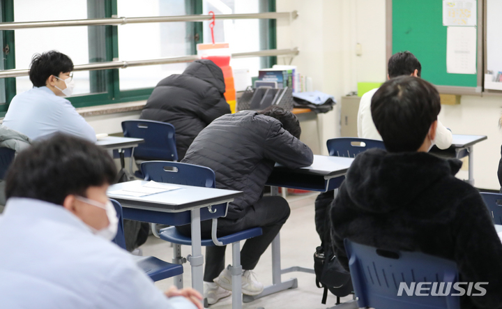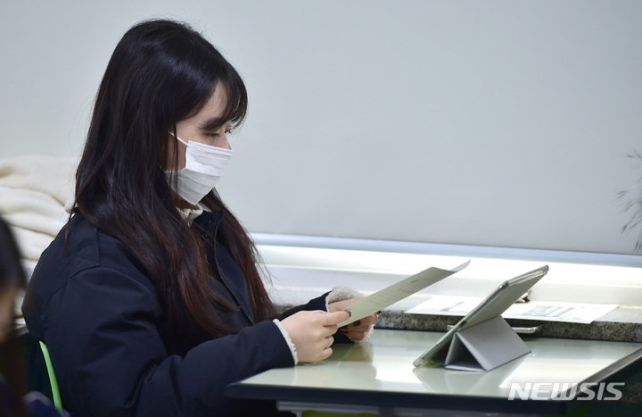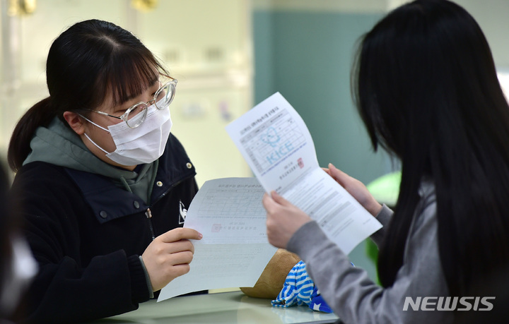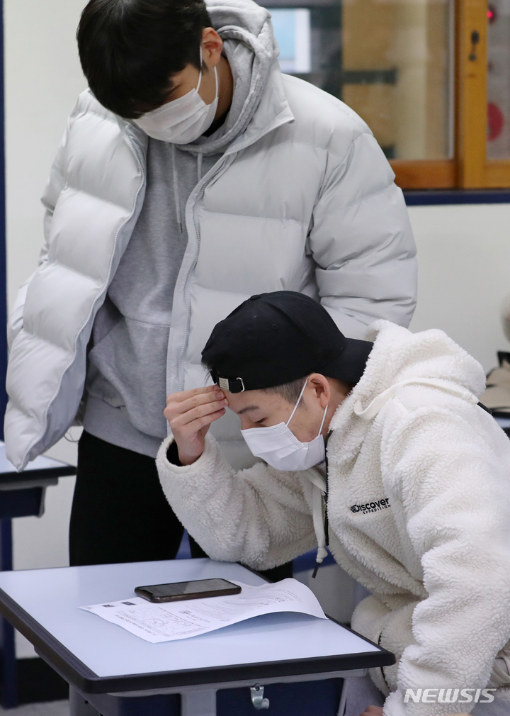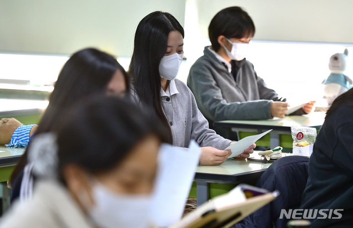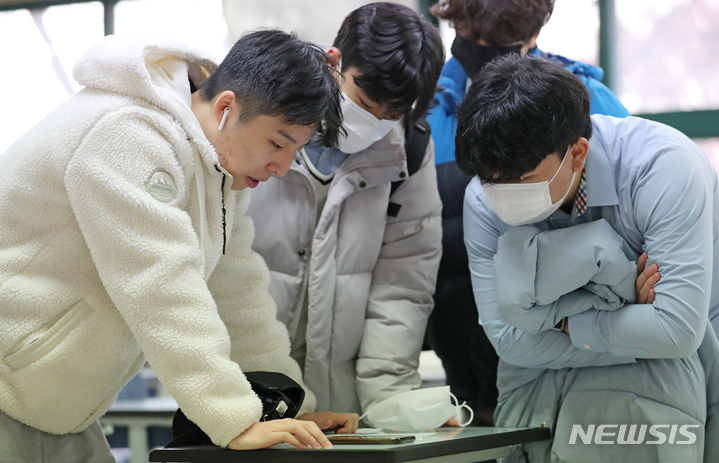 2023年度大学修学能力試験(日本の大学入学共通テストに相当)の成績表が配布された9日午前、ソウル市鍾路区の景福高校では、受験した3年生たちが成績表をチェックしていた(写真=共同取材団)。