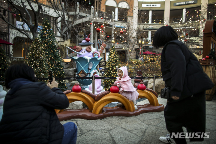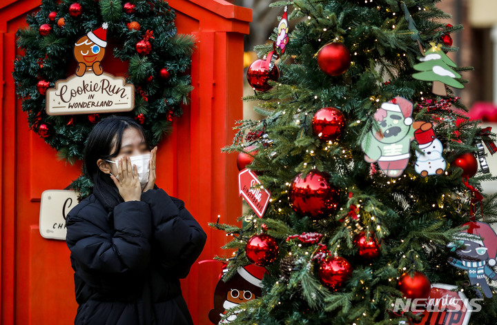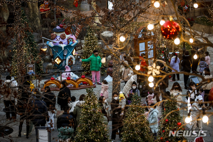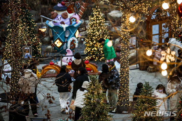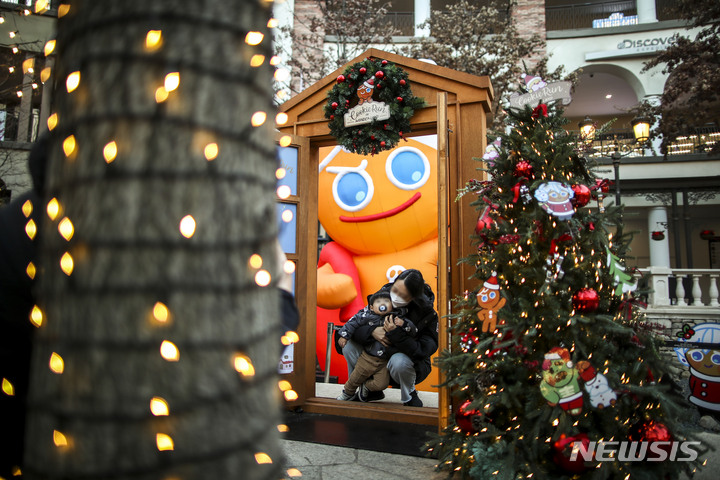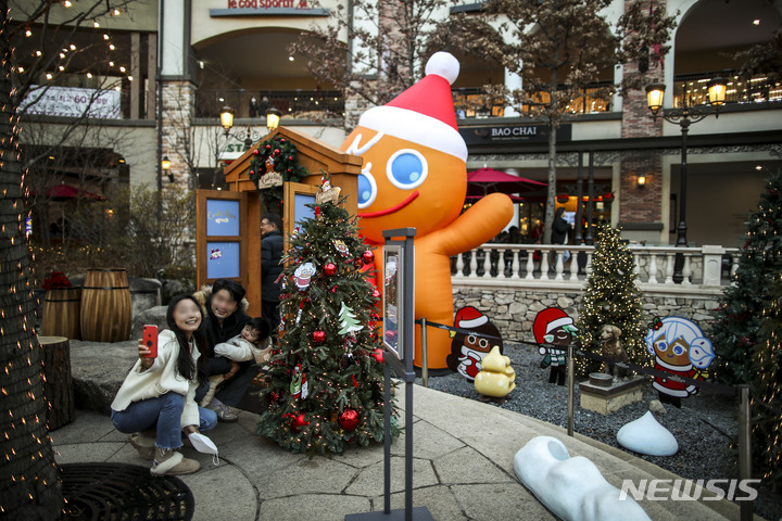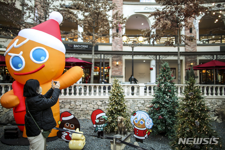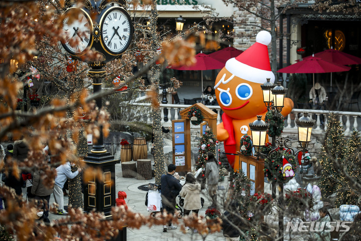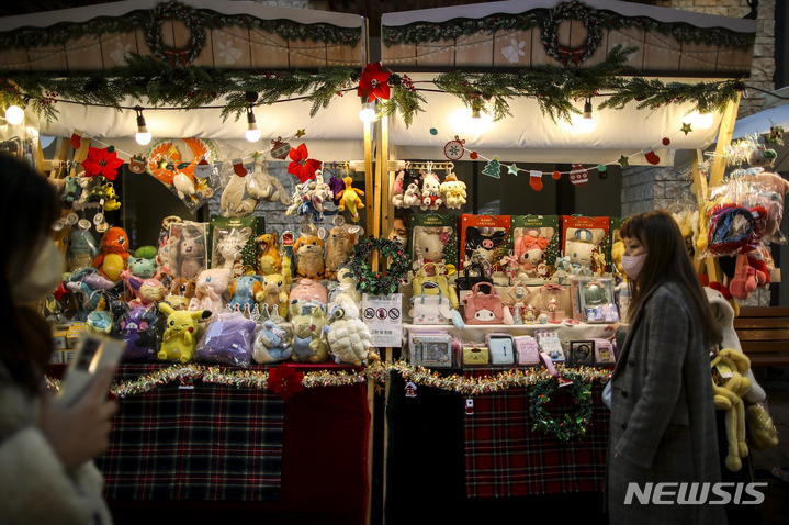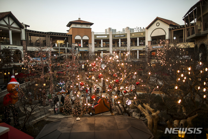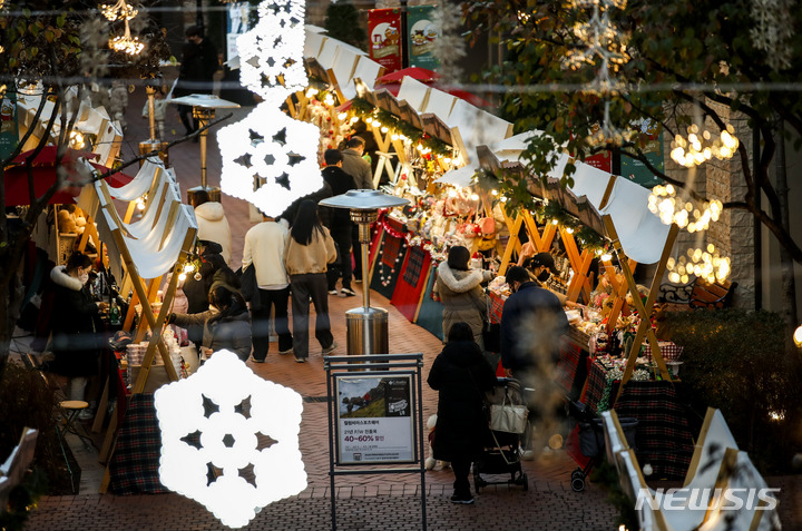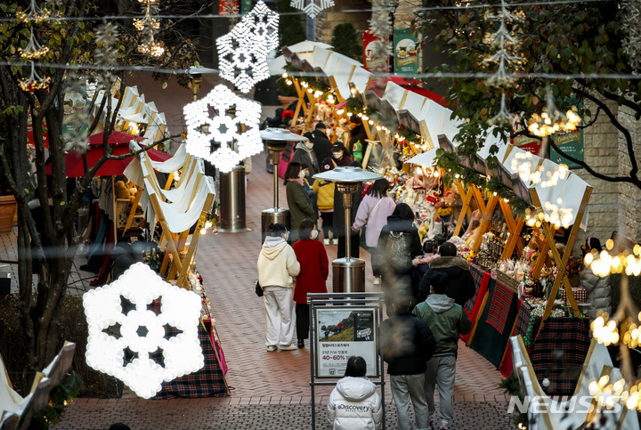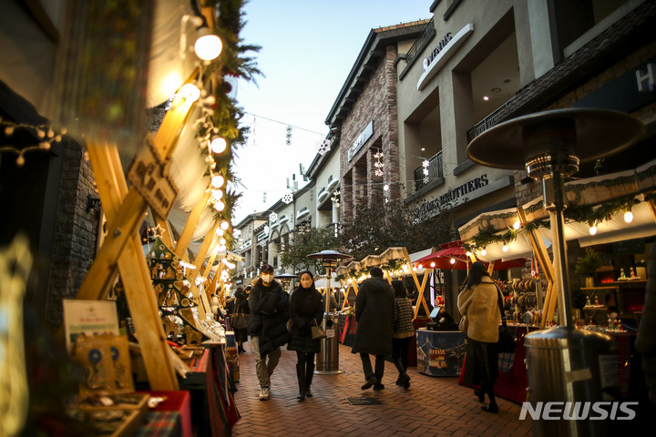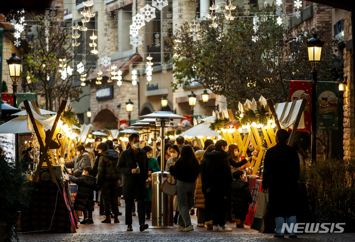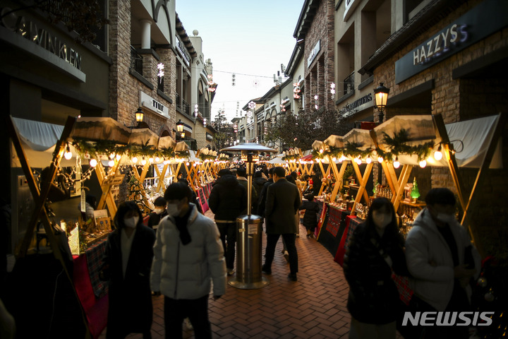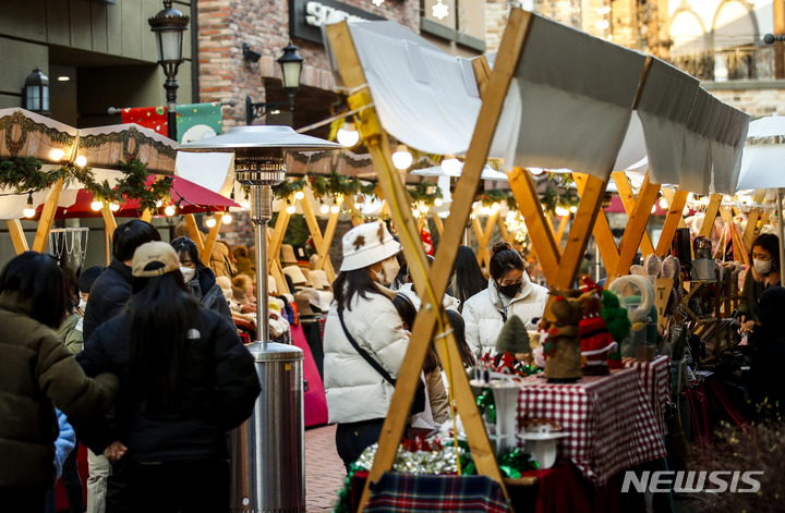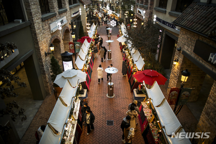 9日午後、京畿道始興市の新世界サイモン始興プレミアムアウトレットを訪れた市民たちが、「ヨーロピアン・クリスマス・トリップ」の一環で設けられたクリスマス・フリーマーケットを見て回っていた。