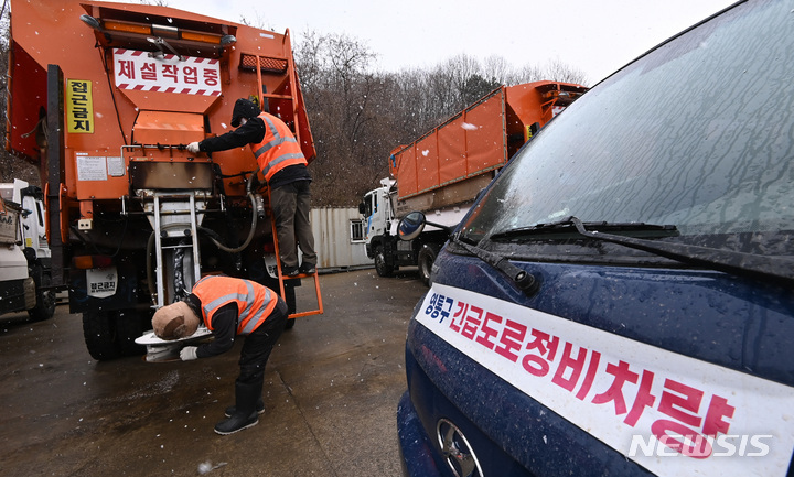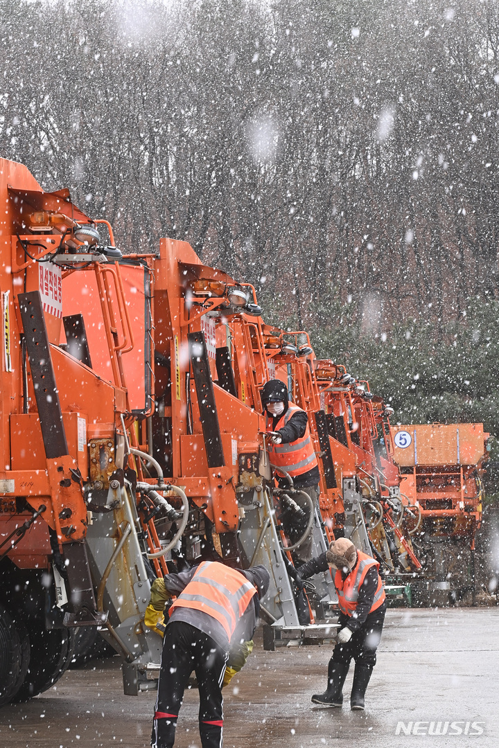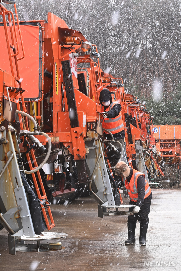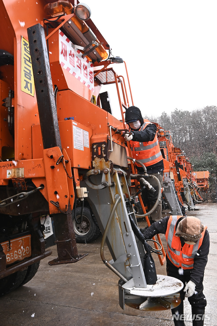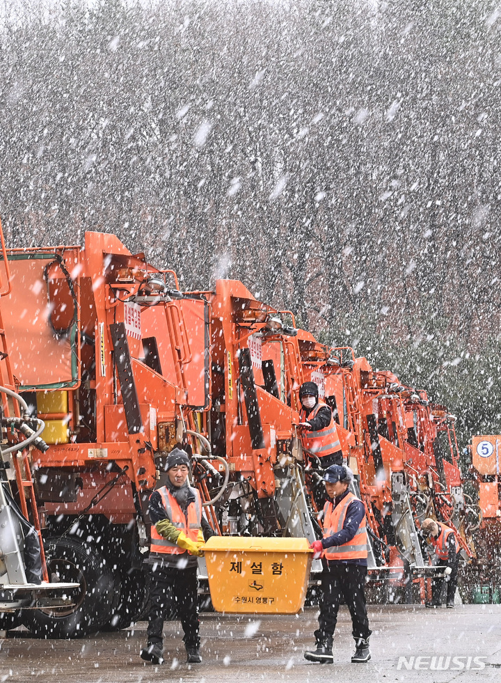 韓国中部地方に大雪注意報が発令された13日、京畿道水原市霊通区の除雪前進基地で、関係者が除雪車など機材の点検をしている様子。