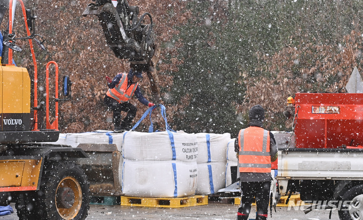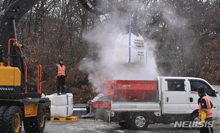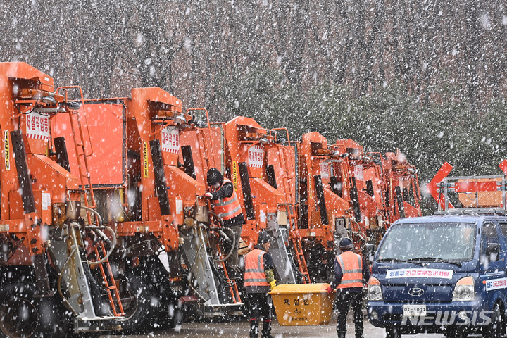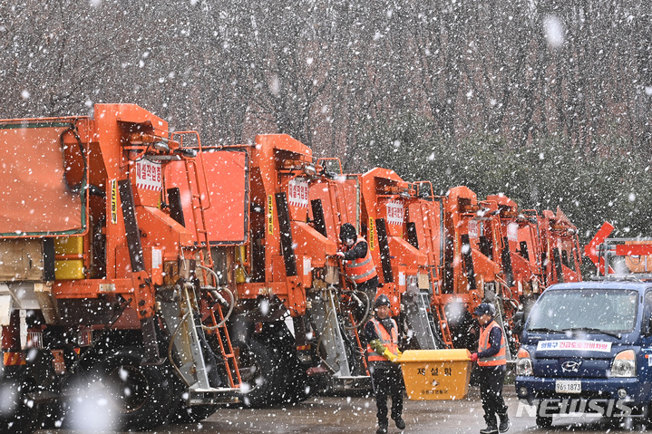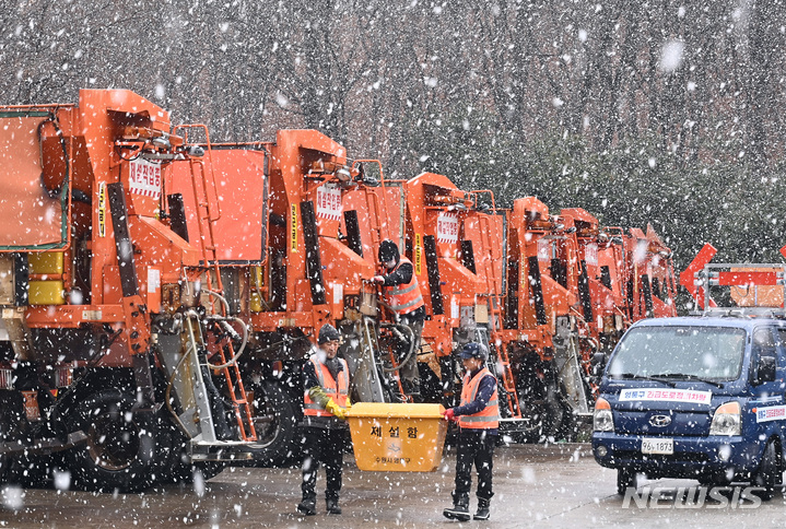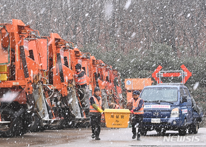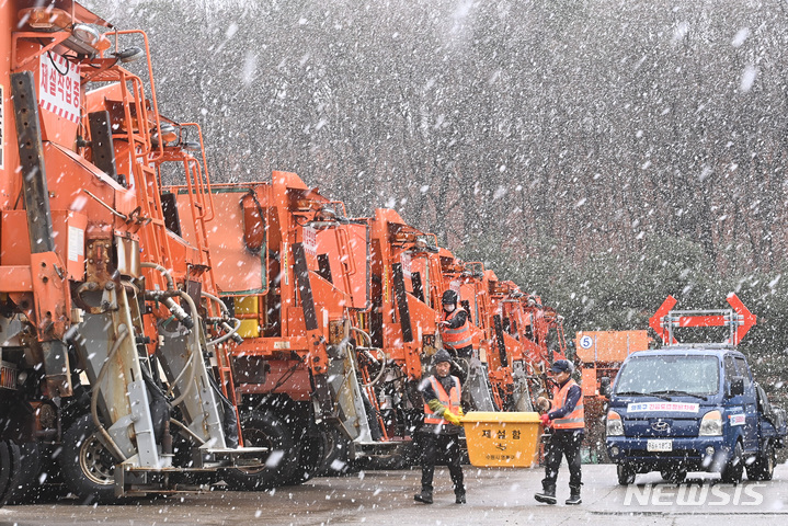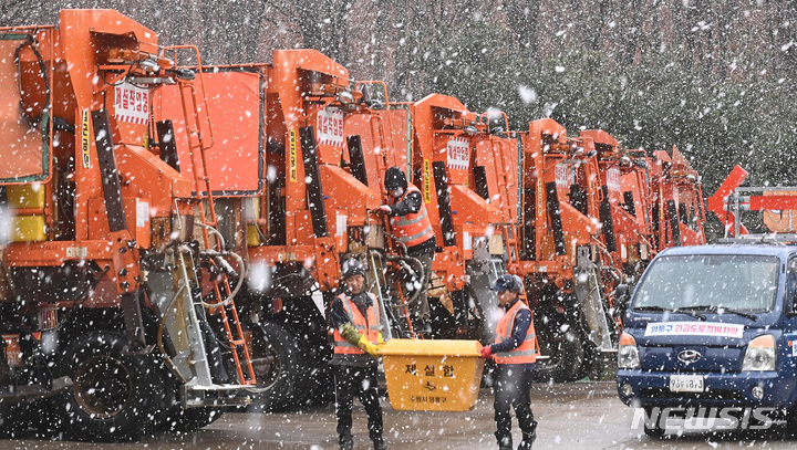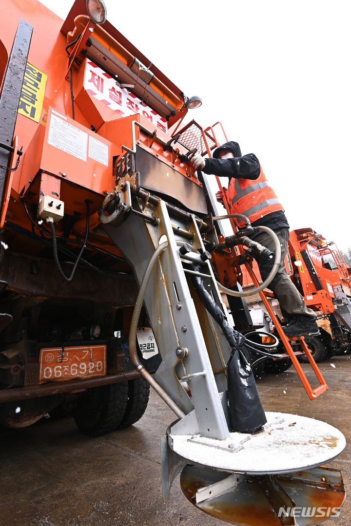 韓国中部地方に大雪注意報が発令された13日、京畿道水原市霊通区の除雪前進基地で、関係者が除雪車など機材の点検をしている様子。