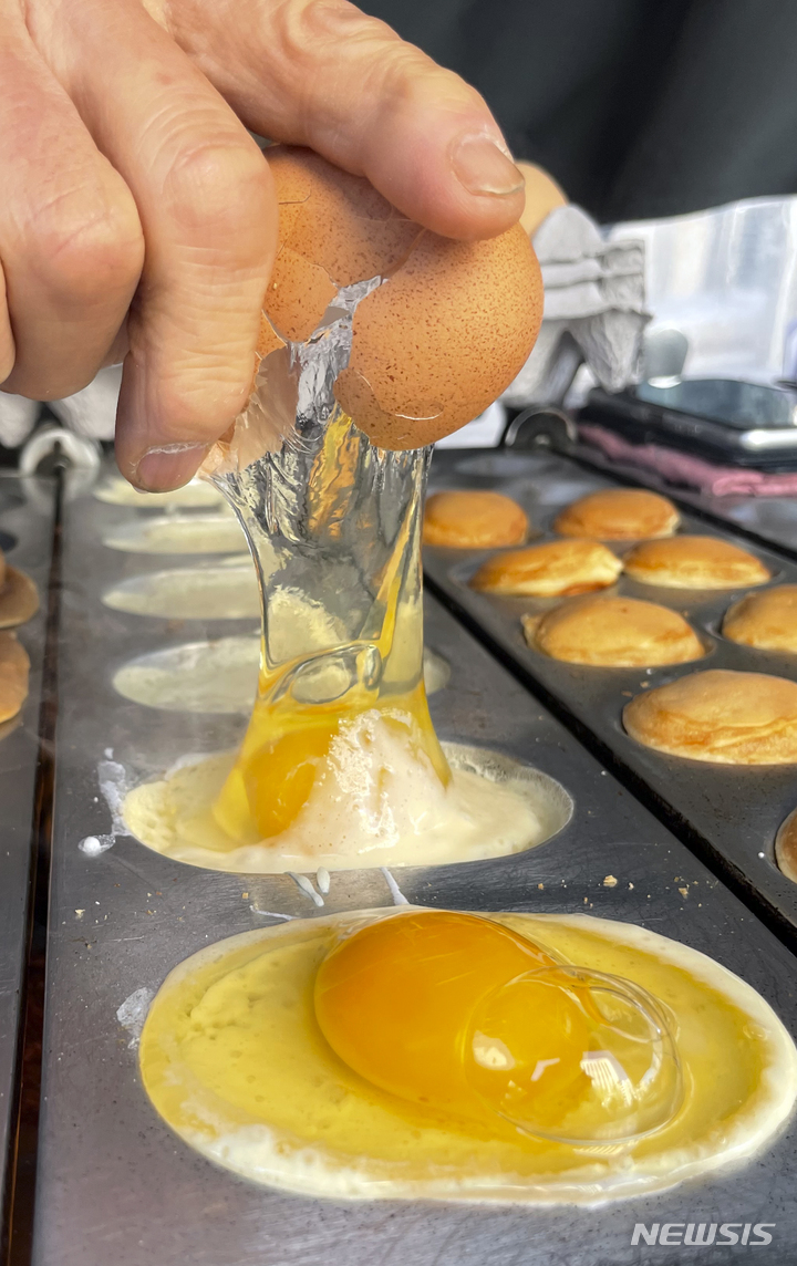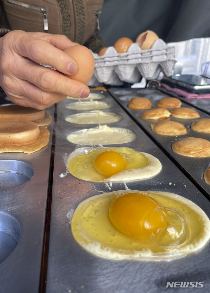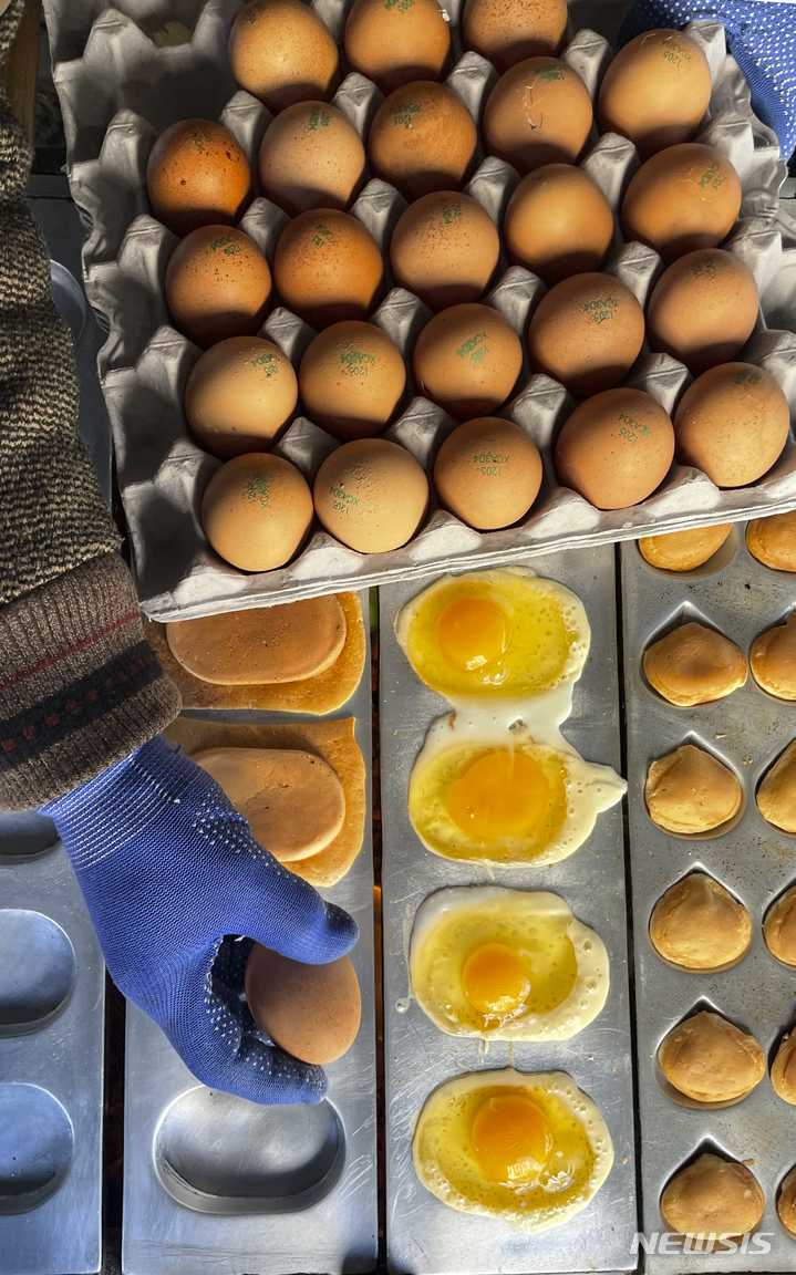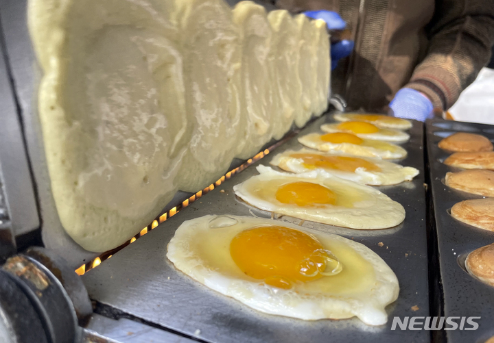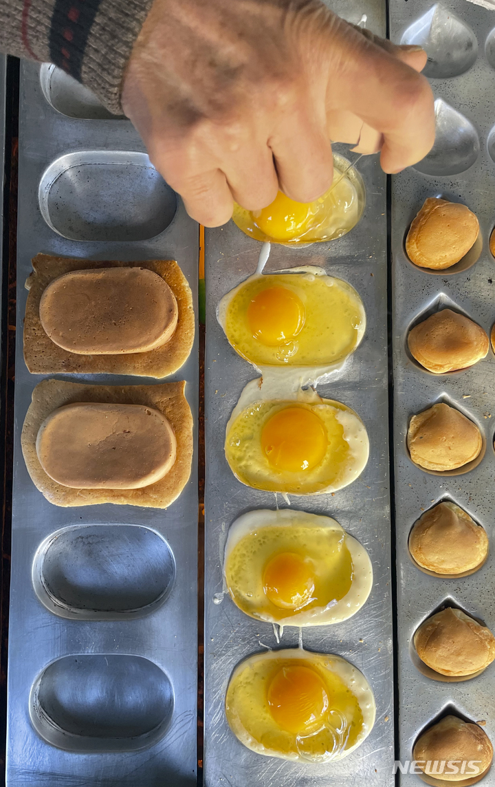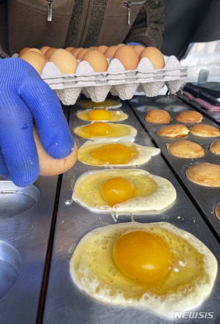 冬に入って高病原性鳥インフルエンザ(AI)の拡大し、その影響で鶏卵の価格が揺れ動いている。写真は14日、ソウル市新設洞で「卵パン」を焼いている商店従業員の様子。