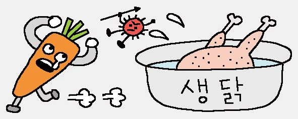 鶏の生肉の表面には嘔吐(おうと)や下痢を引き起こすカンピロバクター菌が存在する。このため、洗う時は水がほかの食べ物にはねないように気をつけなければならない。