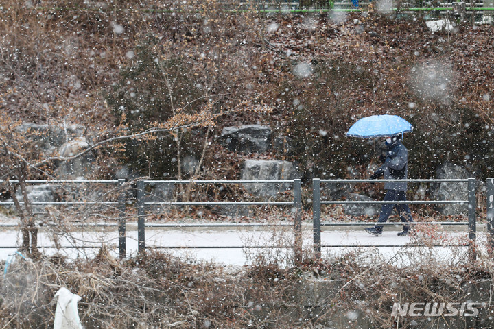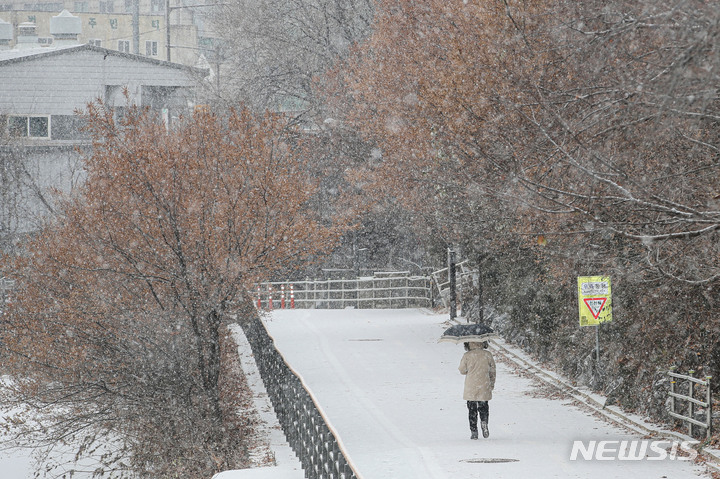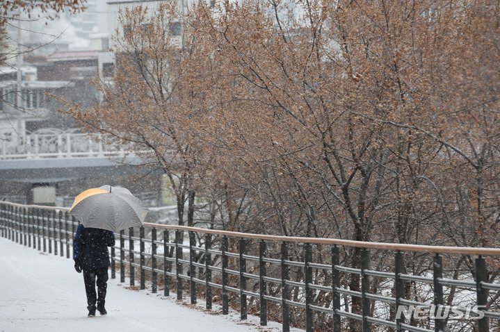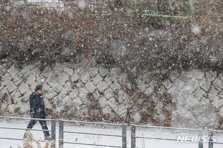 ソウル全域に大雪注意報が発表された15日午前、雪が降っている牛耳川(ソウル市江北区)の様子。