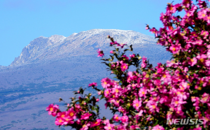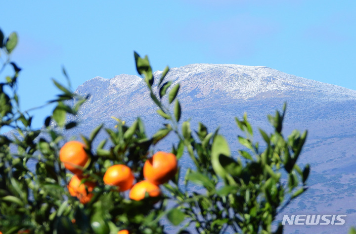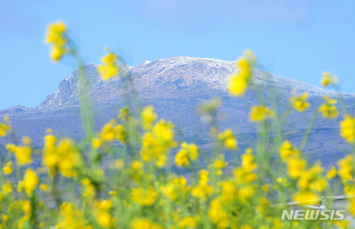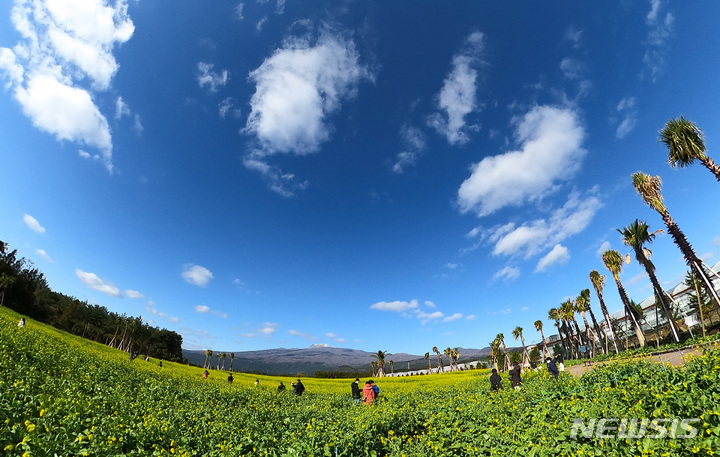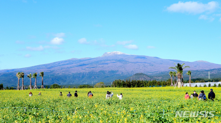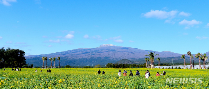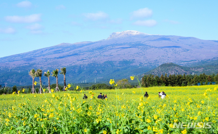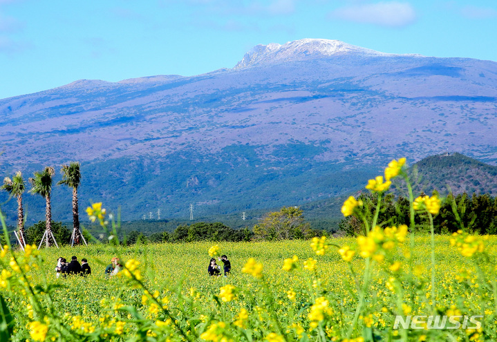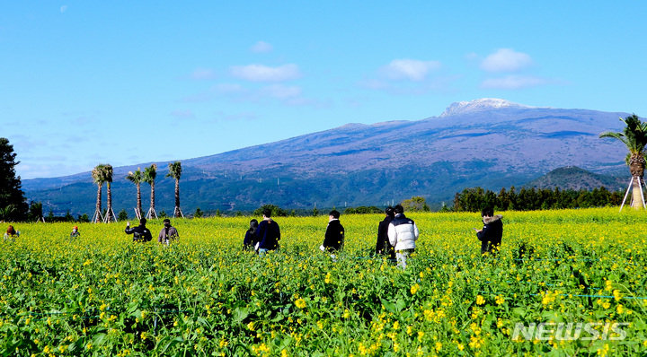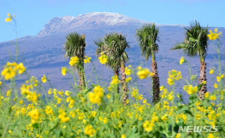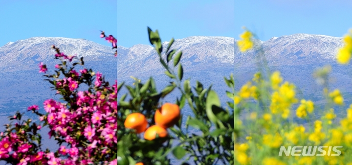 全国的に寒波が猛威を振るっている中、済州道西帰浦市南元邑休愛里の農場では15日午前、春の花である黄色い菜の花が咲いており、雪が積もっている漢拏山と対照的で、異色の趣をかもし出していた。