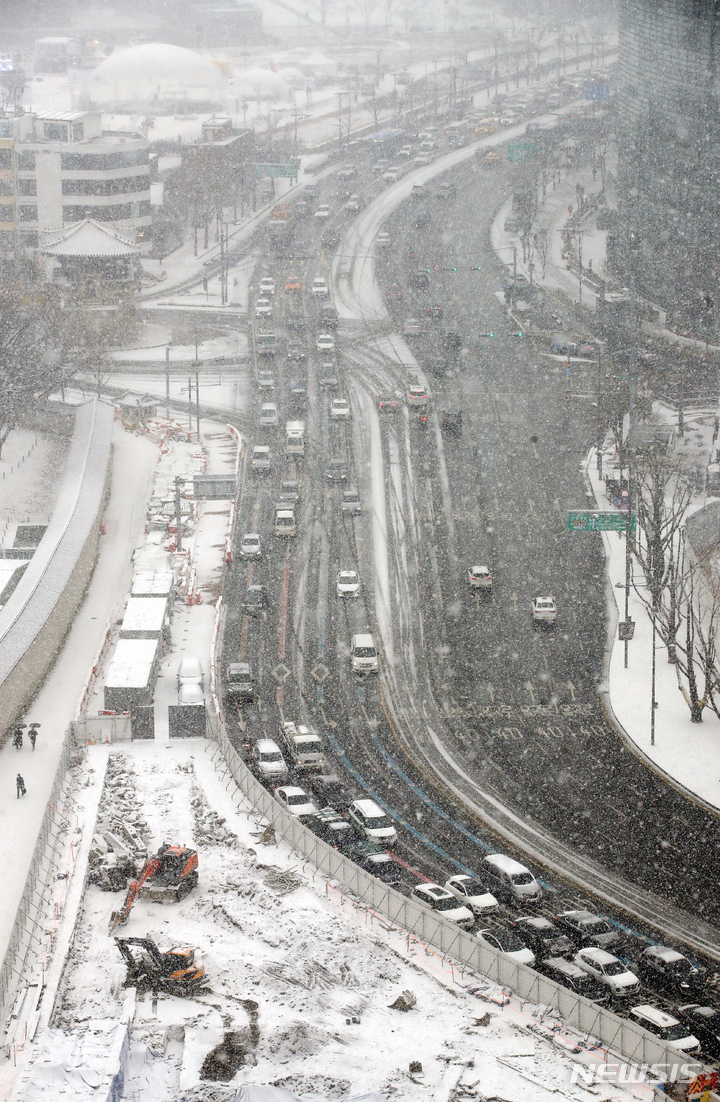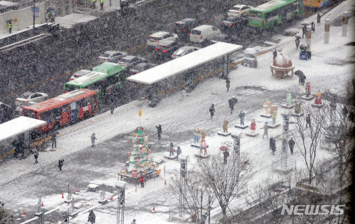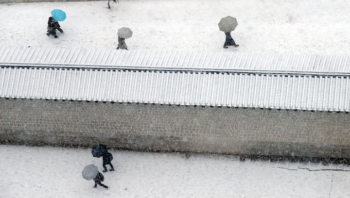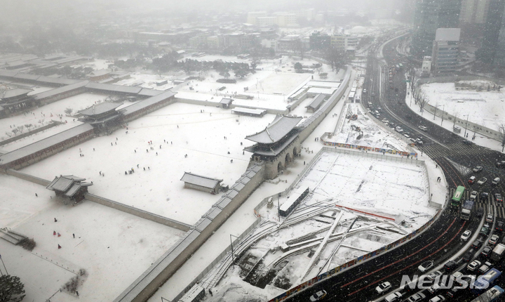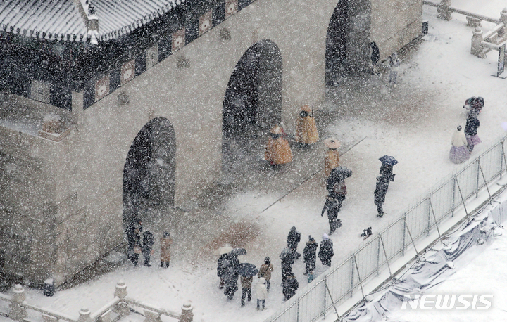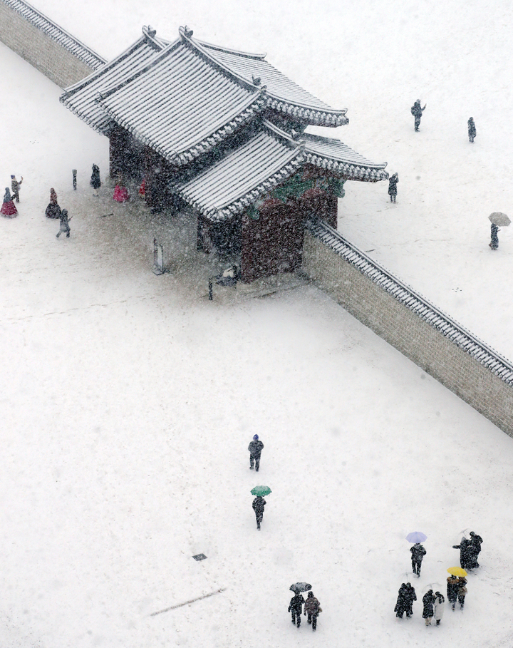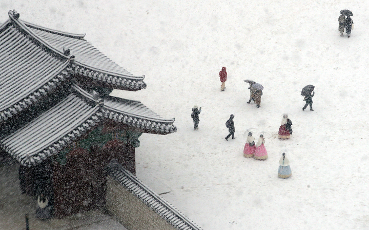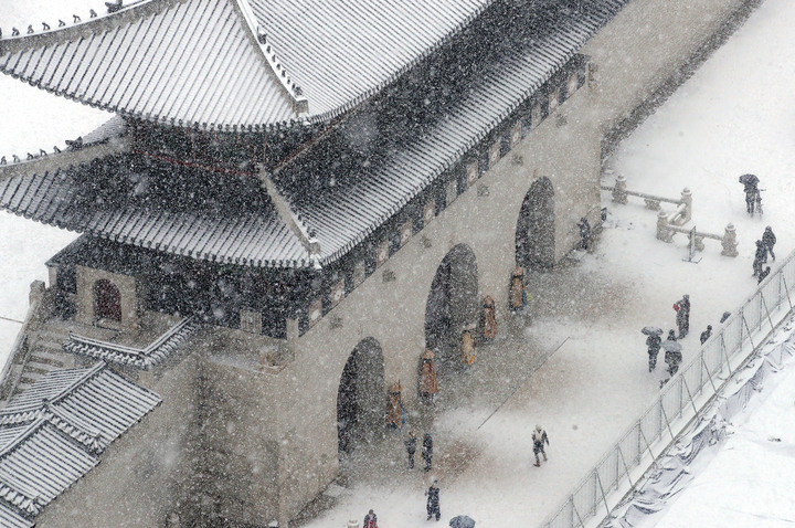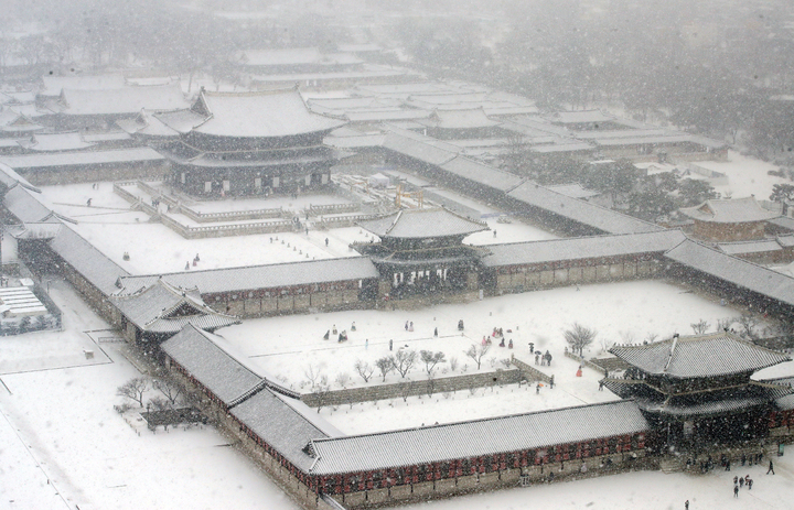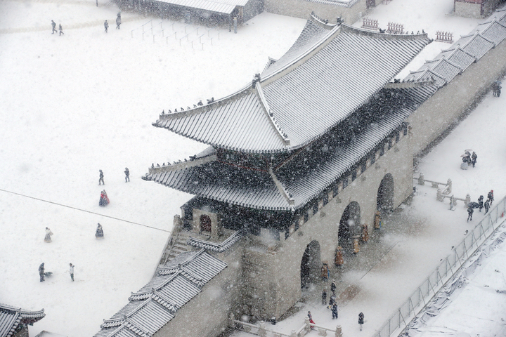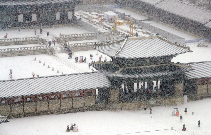 15日、ソウル市鍾路区の景福宮に雪が降っている様子。韓国気象庁はこの日、「きょうは韓国中部地方を中心にかなり雪が降る」と発表した。