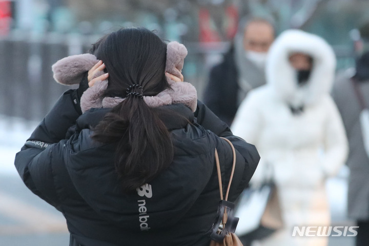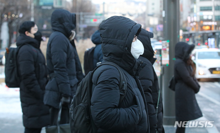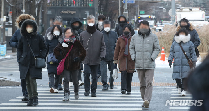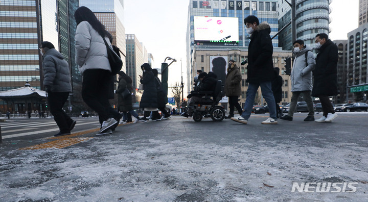 【NEWSIS】厳しい寒さが続いた16日午前、ソウル市鍾路区の光化門交差点で、ダウンジャケットなどしっかりと防寒対策をして凍った道を出勤する人々。