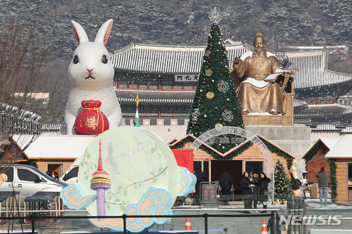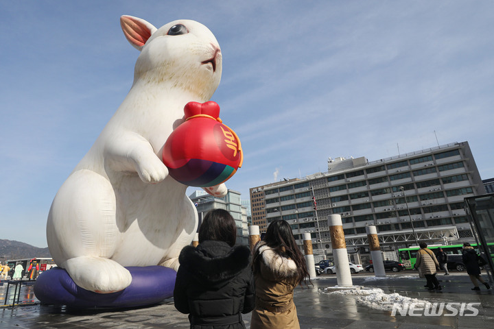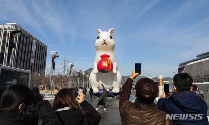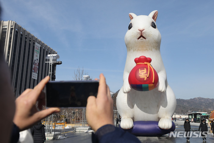 16日午前、ソウル市鍾路区の光化門広場に、うさぎ年の2023年に合わせて大型のウサギが設置されている様子。